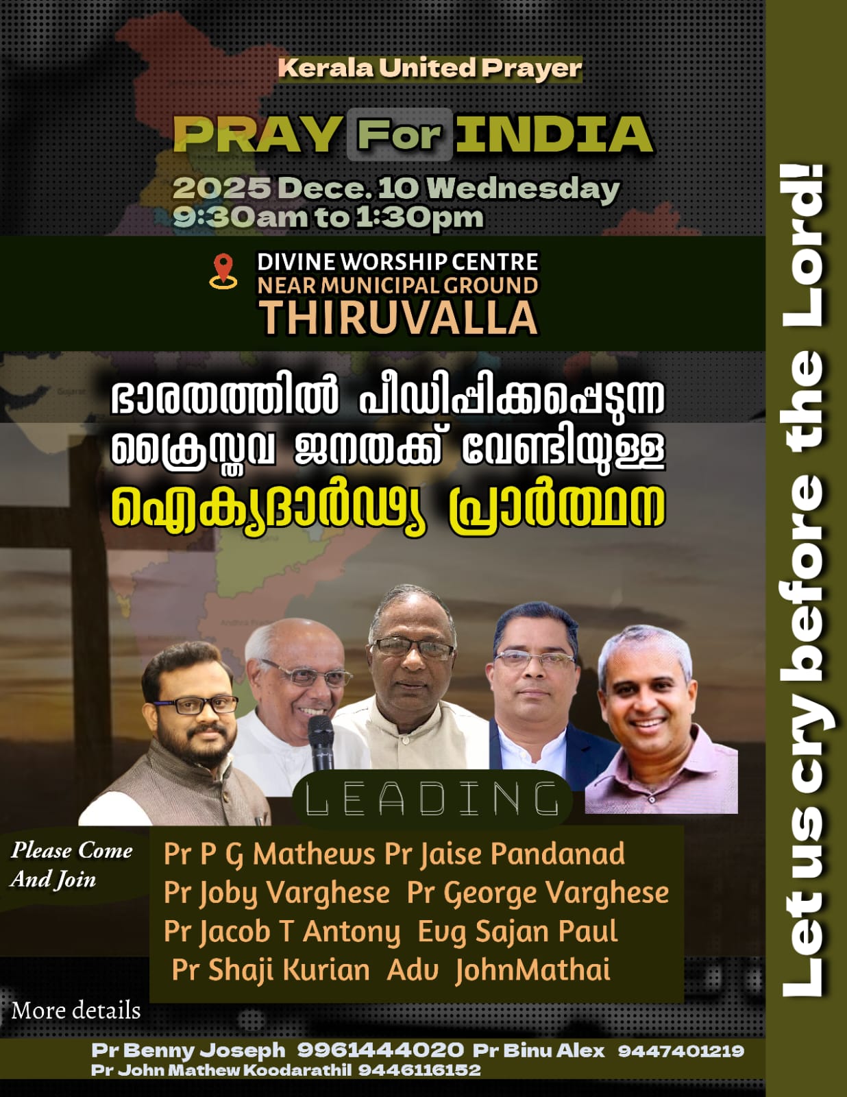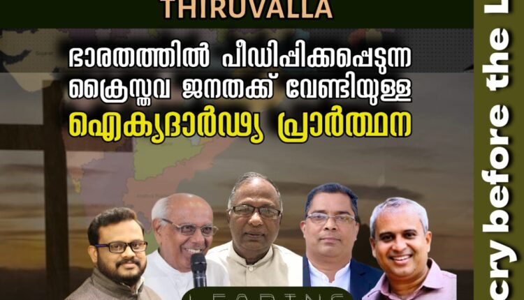 തിരുവല്ല: കേരള യുണൈറ്റഡ് പ്രെയർ ഫെലോഷിപ്പിൻ്റെ നേതൃത്വത്തിൽ “ബ്ലെസ്സ് ഇന്ത്യാ പ്രെയർ” നാളെ രാവിലെ 9 മണി മുതൽ തിരുവല്ല ഡിവൈൻ വർഷിപ്പ് സെൻ്ററിൽ നടക്കും. വർദ്ധിച്ചു വരുന്ന ക്രിസ്തീയ പീഡനം, ആരാധനാലയങ്ങൾക്കെതിരെയുള്ള ആക്രമണം, സുവിശേഷകർക്ക് നേരെയുള്ള ക്രിമിനൽ കേസുകൾ, അന്യായമായ ജൂഡീഷ്യൽ കസ്റ്റഡി, ഉത്തര ഭാരതത്തിൽ നിത്യ സംഭവമായി മാറിയിരിക്കുന്ന ക്രൈസ്തവ രക്ത സാക്ഷിത്വം എന്നിവയുടെ നടുവിൽ നമ്മുടെ രാജ്യത്തിനു വേണ്ടി പ്രാർത്ഥിക്കുവാൻ നാം ഒന്നിക്കുന്നു.
