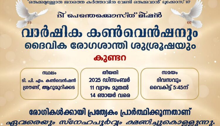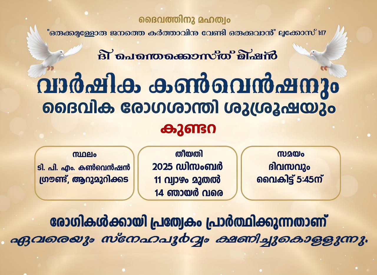 കുണ്ടറ: ദി പെന്തെക്കൊസ്ത് മിഷൻ കുണ്ടറ (കൊട്ടാരക്കര സെന്റർ) വാർഷിക കൺവൻഷൻ ഡിസംബർ 11 വ്യാഴം മുതൽ 14 ഞായർ വരെ ആറുമുറിക്കട റ്റി.പി.എം കൺവൻഷൻ ഗ്രൗണ്ടിൽ നടക്കും.