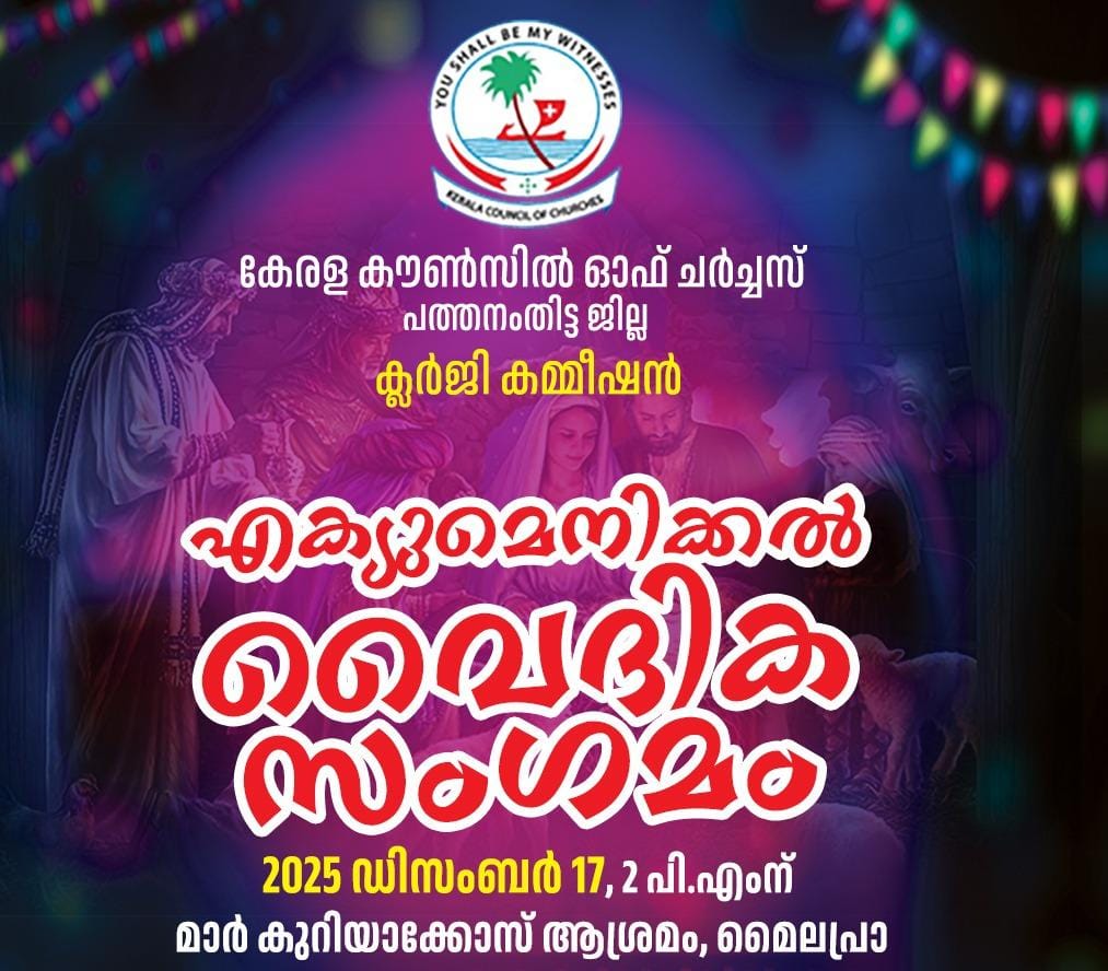 പത്തനംതിട്ട:- കേരള കൗൺസിൽ ഓഫ് ചർച്ചസ് പത്തനംതിട്ട ജില്ലയിലെ പ്രവർത്തനങ്ങളുടെ ഭാഗമായി കെസിസി ജില്ലാ ക്ലർജി കമ്മിഷന്റെ നേതൃത്വത്തിൽ എക്യുമെനിക്കൽ വൈദിക സംഗമം 2025 ഡിസംബർ 17 ഉച്ചയ്ക്ക് 2 മണി മുതൽ മൈലപ്ര മാർ കുര്യാക്കോസ് ആശ്രമത്തിൽ വച്ച് നടത്തപ്പെടുന്നു. കെസിസി ജില്ല ക്ലർജി കമ്മീഷൻ പ്രസിഡന്റ് റവ. ജോർജ് മാത്യു അധ്യക്ഷത വഹിക്കുന്ന യോഗത്തിൽ മലങ്കര ഓർത്തഡോക്സ് സഭയുടെ നിലയ്ക്കൽ ഭദ്രാസനം മെത്രാപ്പോലീത്ത ഡോ. ജോഷ്വാ മാർ നിക്കോദിമോസ് ഉദ്ഘാടനം ചെയ്യുന്നു.