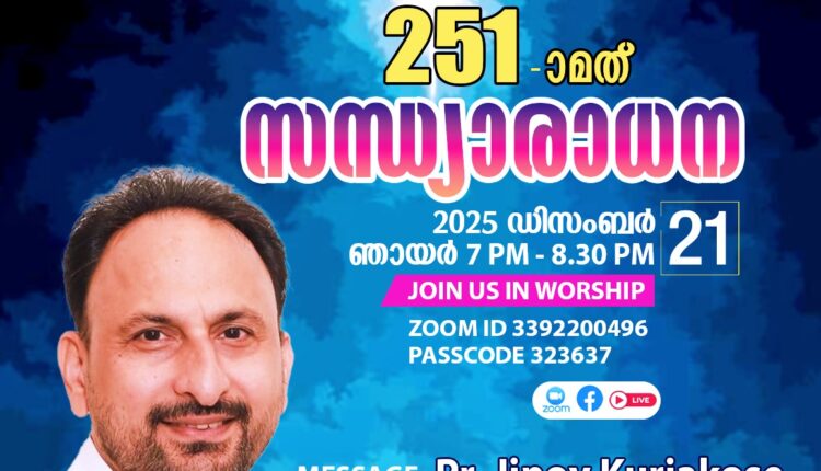 നിലമ്പൂർ: ഡിസംബർ 21 ഞായറാഴ്ച വൈകിട്ട് 7 മണിക്ക് സൂം പ്ലാറ്റ് ഫോമിൽ നടക്കുന്ന ഐ.പി സി. നിലമ്പൂർ സൗത്ത് സെന്റർ സായാഹ്ന സമ്മേളനത്തിൽ പാസ്റ്റർ ജിനോയ് കുര്യാക്കോസ് (ജബൽപൂർ) പ്രസംഗിക്കുന്നു.
