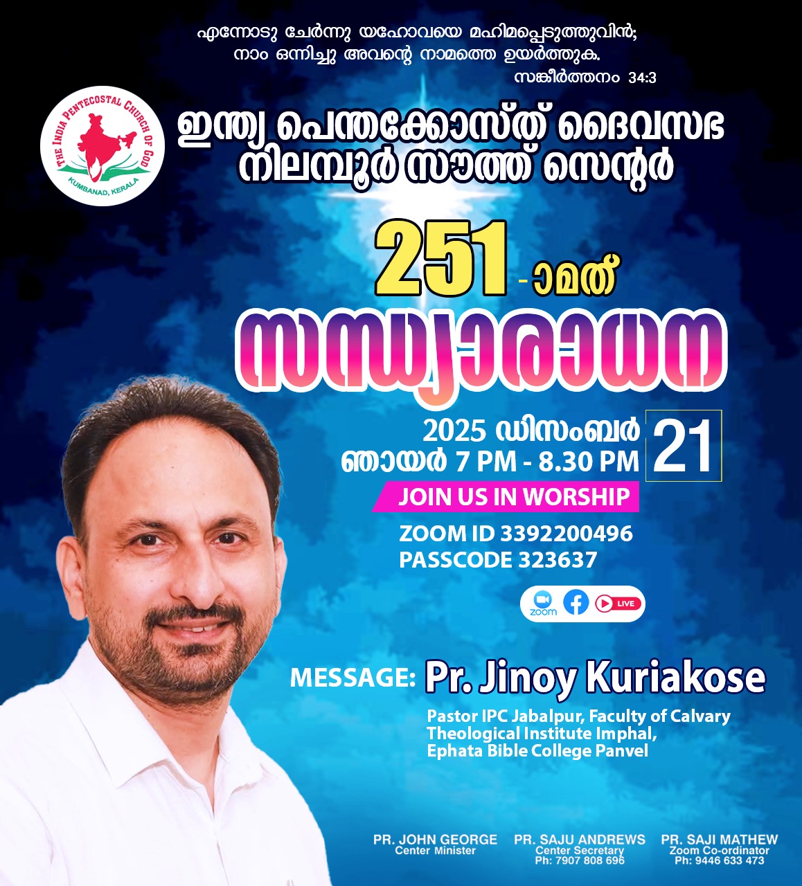 പാസ്റ്റർമാരായ ജോൺ ജോർജ്, സാജു ആൻഡ്രൂസ്, സജി മാത്യു എന്നിവർ നേതൃത്വം നൽകും.