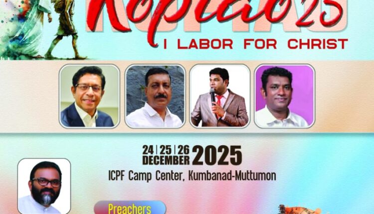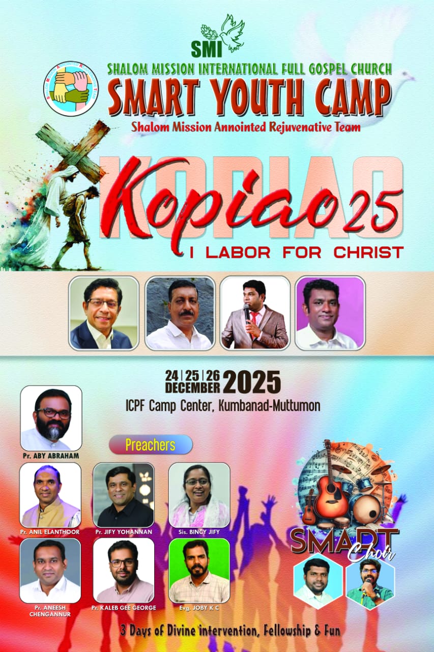ശാലോം മിഷൻ ഇന്റർനാഷണൽ (SMI) ചർച്ചിന്റെ യുവജന വിഭാഗമായ SMART (Shalom Mission Annointed Rejuvanative Team) ന്റെ ഈ വർഷത്തെ ക്യാമ്പ് 2025 ഡിസംബർ 24 25 26 ബുധൻ വ്യാഴം വെള്ളി ദിവസങ്ങളിൽ കുമ്പനാട് മുട്ടുമൺ ഐസിപിഎഫ് ക്യാമ്പ് സെന്ററിൽ വച്ച് നടത്തപ്പെടുന്നു ഈ വർഷത്തെ തീം “Copiao” (I Labor for christ) എന്നുള്ളതാണ്.