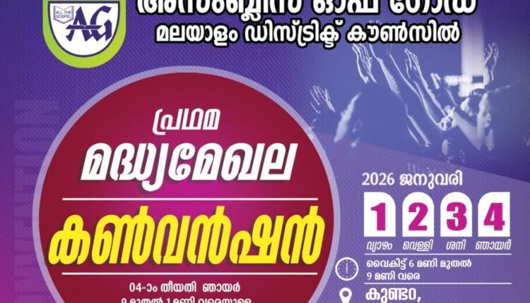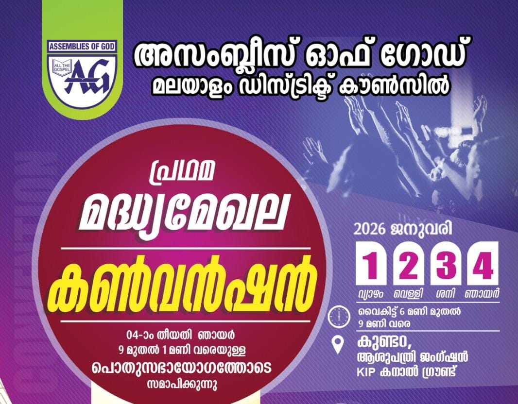 അസംബ്ലീസ് ഓഫ് ഗോഡ് മദ്ധ്യ മേഖല പ്രഥമമായി സംഘടിപ്പിക്കുന്ന മേഖല കൺവെൻഷൻ ജനുവരി 1 മുതൽ 4 വരെ കുണ്ടറ കെ ഐ പി കനാൽ ഗ്രൗണ്ടിൽ നടത്തപ്പെടുന്നു. കൊല്ലം, ആലപ്പുഴ, പത്തനംതിട്ട, കോട്ടയം, ജില്ലകളിലെ 26 സെക്ഷനുകളിൽ നിന്നുള്ള ദൈവദാസന്മാരും ദൈവമക്കളും ഈ ആത്മീയ സംഗമത്തിൽ പങ്കെടുക്കും.