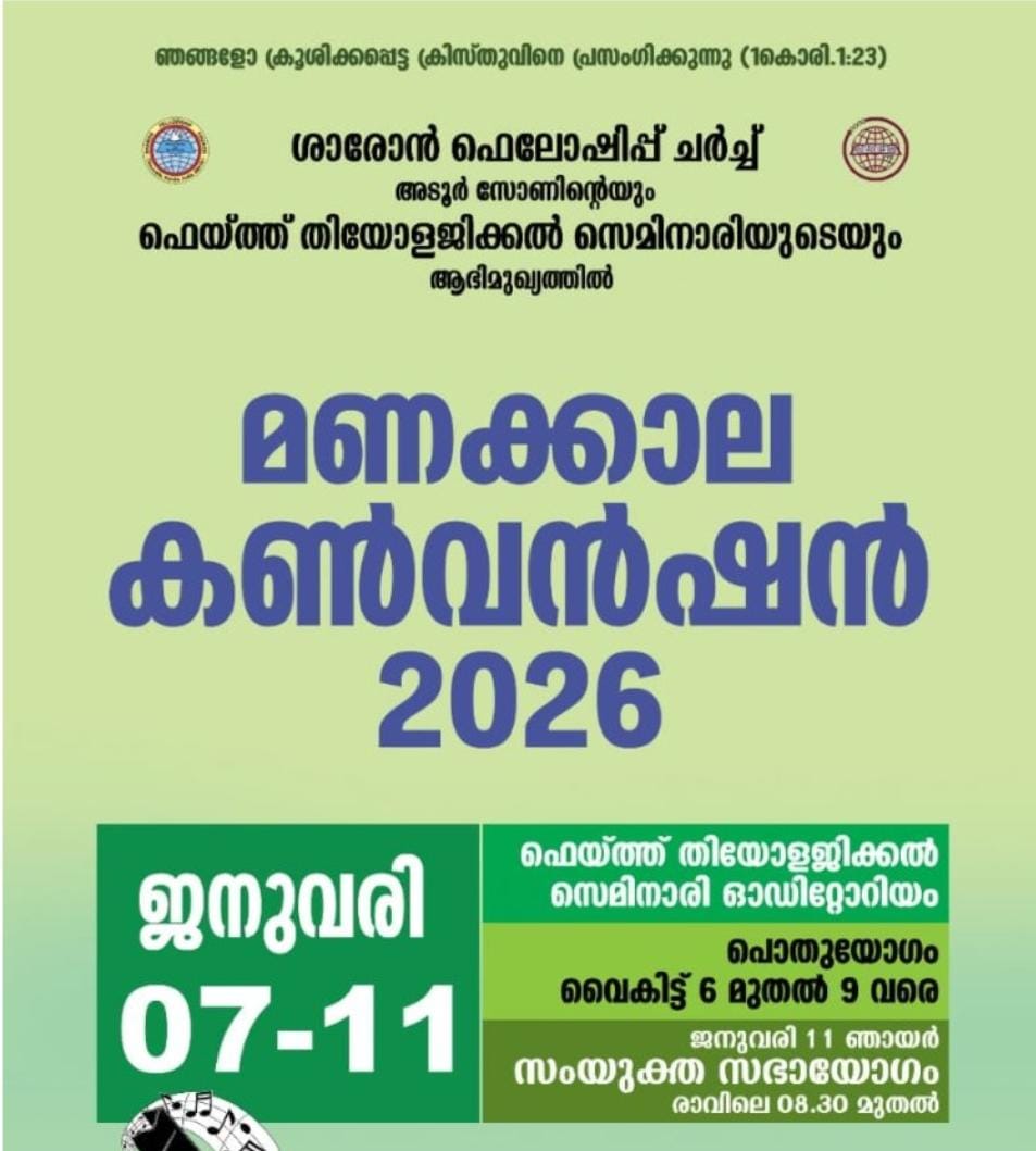 അടൂർ: ശാരോൻ ഫെലോഷിപ്പ് ചർച്ച് അടൂർ സോണിന്റെയും ഫെയ്ത്ത് തിയോളജിക്കൽ സെമിനാരിയുടെയും ആഭിമുഖ്യത്തിൽ സംഘടിപ്പിക്കുന്ന മണക്കാല കൺവൻഷൻ 2026 ജനുവരി 7 മുതൽ 11 വരെ ഫെയ്ത്ത് തിയോളജിക്കൽ സെമിനാരി ഓഡിറ്റോറിയം വേദിയാകും.