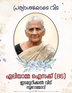 മല്ലപ്പള്ളി: ഇടമുറിക്കൽ വീട്ടിൽ പരേതനായ പി വി ഐസക്കിന്റെ സഹധർമിണി ഏലിയാമ്മ ഐസക്ക് (86) നിത്യതയിൽ ചേർക്കപെട്ടു പരേത ദി പെന്തകോസ്ത്