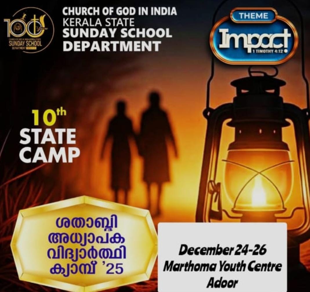 മുളക്കുഴ: ചർച്ച് ഓഫ് ഗോഡ് ഇൻ ഇന്ത്യാ കേരളാ സ്റ്റേറ്റ് സണ്ടേസ്കൂൾ ഡിപ്പാർട്ട്മെൻ്റിൻ്റെ ആഭിമുഖ്യത്തിൽ നടക്കുന്ന സംസ്ഥാന അദ്ധ്യാപക വിദ്യാർത്ഥി ക്യാമ്പ് നാളെ മുതൽ (ഡിസംബർ 24,25,26) അടൂർ മാർത്തോമ്മാ യൂത്ത് സെൻ്ററിൽ നടക്കും. സൺഡേസ്കൂൾ പ്രസിഡണ്ട് പാസ്റ്റർ വി.പി തോമസിന്റെ അധ്യക്ഷതയിൽ സ്റ്റേറ്റ് ഓവർസിയർ പാസ്റ്റർ വൈ. റെജി ക്യാമ്പ് ഉദ്ഘാടനം ചെയ്യും.