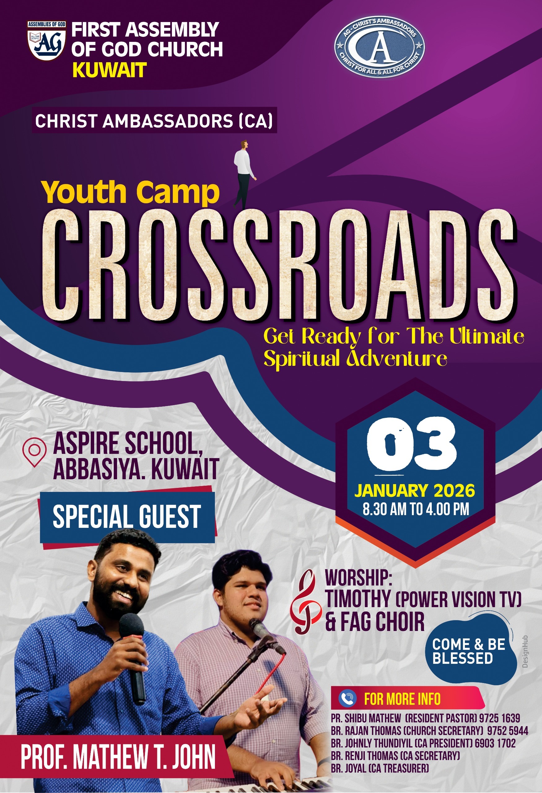 കുവൈറ്റ് ഫസ്റ്റ് അസംബ്ലി ഓഫ് ഗോഡ് സഭയുടെ യുവജന വിഭാഗമായ ക്രൈസ്റ്റ് അംബാസ്സഡർസ് (സി എ) സംഘടിപ്പിക്കുന്ന ഏകദിന യൂത്ത് ക്യാമ്പ് “ക്രോസ്റോഡ്സ്” (ക്രോസ്സ്റോഡ്സ് ) ന്റെ ഫ്ലയർ പ്രകാശനം ചെയ്തു. സഭാ ശുശ്രുഷകൻ പാസ്റ്റർ ഷിബു മാത്യു, ചർച്ച് സെക്രട്ടറി രാജൻ തോമസിന് നൽകികൊണ്ടാണ് പ്രകാശനം നിർവ്വഹിച്ചത്.