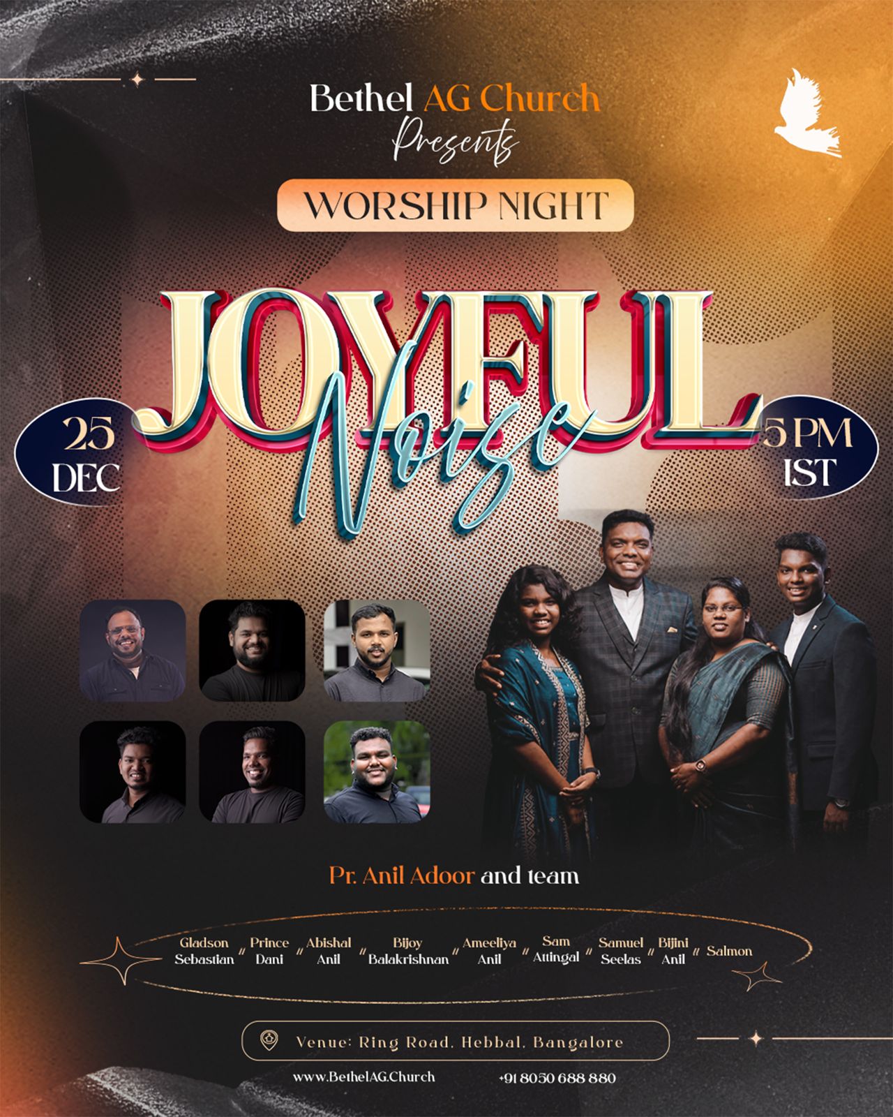 ബെംഗളൂരു: ബഥേൽ എ.ജി സഭയുടെ ആഭിമുഖ്യത്തിൽ ക്രിസ്മസ് ദിനമായ ഡിസംബർ 25 വൈകിട്ട് 5ന് ഹെബ്ബാൾ സഭാഹാളിൽ വെച്ച് പാസ്റ്റർ അനിൽ അടൂരും ടീമും നയിക്കുന്ന ജോയ്ഫുൾ നോയിസ് സംഗീത ആരാധന നടക്കും.