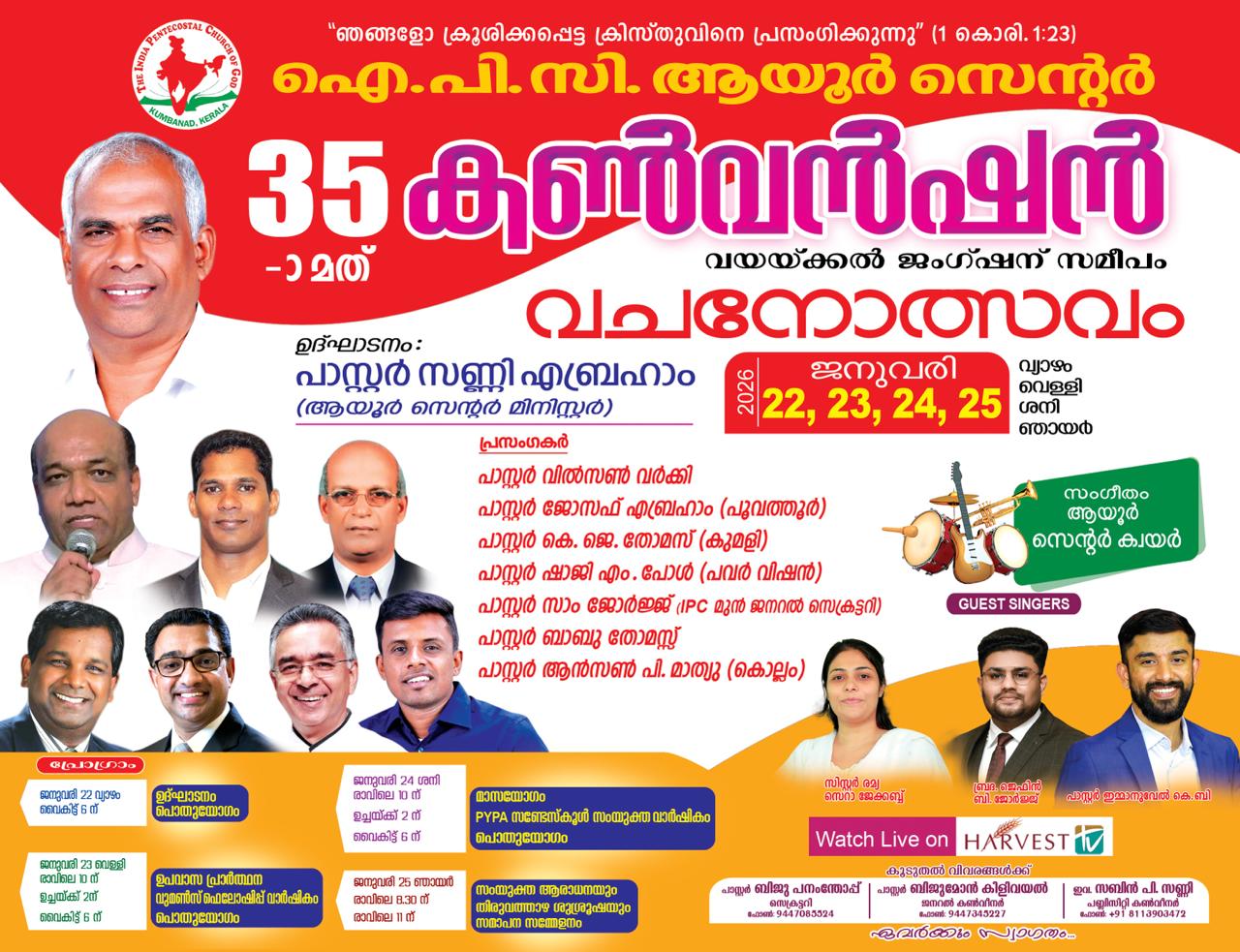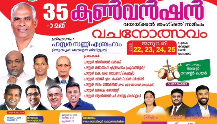 ആയൂർ: ഇന്ത്യ പെന്തക്കോസ്തു ദൈവസഭ ആയൂർ സെന്ററിന്റെ 35 – മത് വാർഷിക കൺവൻഷൻ ഐ. പി. സി ഗിൽഗാൽ വയയ്ക്കൽ സഭാ ഹാളിന് സമീപം തയ്യാറാക്കി യിരിക്കുന്ന പന്തലിൽ വച്ച് 2026 ജനുവരി 22, 23, 24, 25 (വ്യാഴം, വെള്ളി, ശനി, ഞായർ) തീയതികളിൽ നടത്തപ്പെടുന്നു.