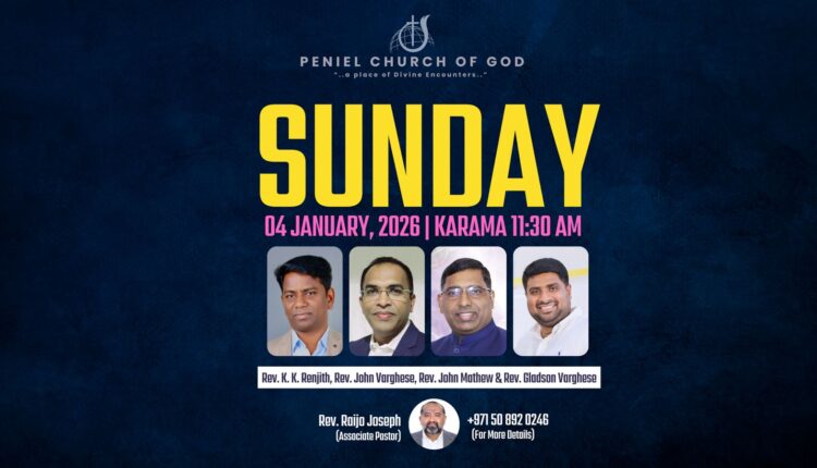 ജനുവരി 4 ഞായറാഴ്ച, പകൽ 11:30 ന് കാരാമയിൽ നടക്കുന്ന പ്രത്യേക ആരാധന യോഗത്തിൽ യുഎഇ യുണൈറ്റഡ് പെന്തക്കോസ്റ്റൽ ഫെലോഷിപ്പ് പ്രസിഡന്റ് പാസ്റ്റർ ജോൺ വർഗ്ഗീസ്, ജനറൽ കോർഡിനേറ്റർ പാസ്റ്റർ ജോൺ മാത്യു എന്നിവർ പ്രത്യേക ക്ഷണിതാക്കളാകും.