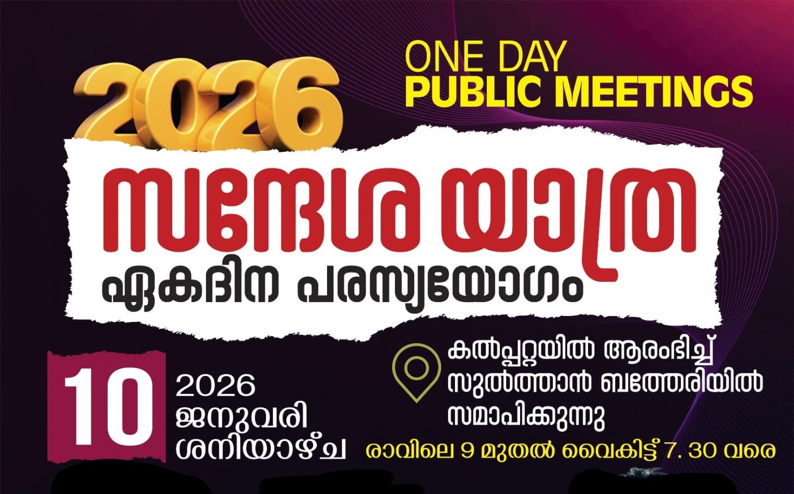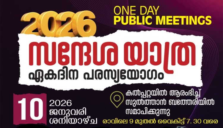 ജില്ലയിലെ പാസ്റ്റേഴ്സിനെയും സഹോദരി സഹോദരന്മാരെയും ഉൾക്കൊള്ളിച്ചുകൊണ്ട് 2026 ജനുവരി 10 ഈ ശനിയാഴ്ച രാവിലെ 9 മുതൽ കൽപ്പറ്റ പുതിയ ബസ്റ്റാൻഡ് പരിസരത്തുനിന്ന് ആരംഭിച്ച്, കൽപ്പറ്റ ടൗൺ മുട്ടിൽ, കാക്കവയൽ, കാര്യംപാടി, മീനങ്ങാടി, കൊളഗപ്പാറ, ബീനാച്ചി, സുൽത്താൻബത്തേരി കോടതിപ്പടി, ഗാന്ധി ജംഗ്ഷൻ തുടങ്ങി ചുങ്കം ജംഗ്ഷനിൽ സമാപിക്കുന്നു.