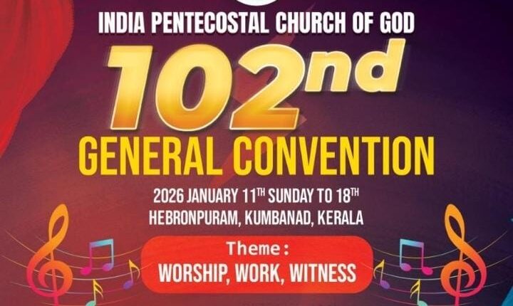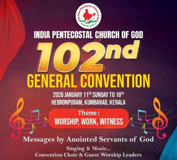 കുമ്പനാട്: ഇൻഡ്യാ പെന്തെക്കോസ്ത് ദൈവസഭ 102-ാമത് ജനറൽ കൺവൻഷൻ നാളെ ആരംഭിക്കും. വൈകിട്ട് 5.30ന് ജനറൽ സെക്രട്ടറി പാസ്റ്റർ ബേബി വർഗീസിൻ്റെ അധ്യക്ഷതയിൽ കൂടുന്ന യോഗത്തിൽ ജനറൽ പ്രസിഡൻ്റ് പാസ്റ്റർ വൽസൺ ഏബ്രഹാം കൺവൻഷൻ ഉദ്ഘാടനം ചെയ്യും. പാസ്റ്റർ വി ജെ തോമസ് പ്രസംഗിക്കും.