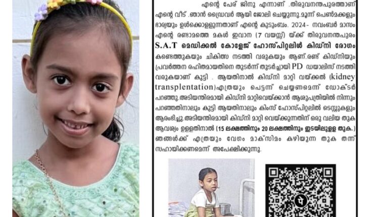 തിരുവനന്തപുരം: 2024 നവംബർമാസം വരെ ദർശനാ ഹയർ സെക്കന്ററി സ്കൂളിലെ ഒന്നാം ക്ലാസ്സിലെ കൂട്ടുകാരോടോത് ഒരു പൂമ്പാറ്റയെപ്പോലെ പാറി നടന്ന് കളിക്കുകയും പഠിക്കുകയും ചെയ്ത നെടുമങ്ങാട് പൂവത്തൂർ ഏഡൻ വില്ലയിൽ ചർച്ച് ഓഫ് ഗോഡ് മണ്ണതറ ജിനുവിന്റെയും നിഖിത യുടെയും മൂന്ന് പെൺമക്കളിൽ 2 മത്തെ മകൾ ഇവനമോൾക്ക് പെട്ടന്ന് ഉണ്ടായ ശരീരിക പ്രയാസത്തെ തുടർന്ന് ഹോസ്പിറ്റലിൽ കാണിക്കുകയും തുടർന്ന് വിദഗ്ദ്ധ ചികത്സക്കയി SAT ഹോസ്പിറ്റൽ തിരുവനന്തപുരത്തെ ഡോക്ടർമാരുടെ വിദഗ്ദ്ധ പരിശോധനക്കു ശേഷം കുഞ്ഞിന്റെ രണ്ട് വൃക്കകളും തകരാറിലാണന്നും ഉടൻ തന്നെ കിഡ്നി മാറ്റിവയ്ക്കണം എന്ന് നിർദേശിച്ചതിനെ തുടർന്ന് ഡയാലിസിസ് ആരംഭിക്കുകയും തിരുവനന്തപുരം KIMS ഹോസ്പിറ്റലിൽ ട്രാസ്പ്ലാന്റ് ഉടൻ നടത്താൻ ക്രമീകരിക്കുന്നു. ഏകദേശം 20 ലക്ഷം രൂപ ചെലവ് വരുന്ന ഈ സർജറിക്ക് വാഹനത്തിന്റെ വളയം പിടിച്ച് ഉപജീവനം നയിക്കുന്ന ജിനുവിന് ആ ജോലിക്കും പോകാൻ സാധിക്കാതെ മാനസികമായും സാമ്പത്തികമായും തളർന്ന ഈ കുടുംബത്തിന് , മൂന്നു പെൺകുഞ്ഞുങ്ങളുടെ മുഖത്തെ ചിരിമായാതെ ഇവാനമോളെ ജീവിതത്തിലേക്ക് തിരികെ കൊണ്ടുവരാൻ ദൈവമക്കളുടെ പ്രാർത്ഥനയും സഹായവും അപേഷിക്കുന്നു.