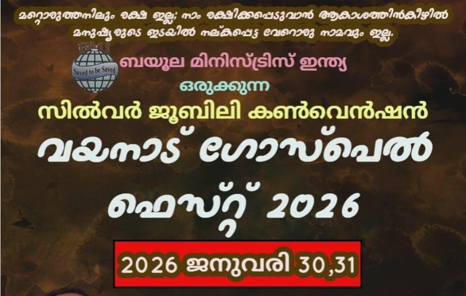 വയനാട്: ബ്യൂലാ മിനിസ്ട്രീസ് ഇന്ത്യയുടെ ആഭിമുഖ്യത്തിൽ ജനുവരി 30,31 തീയതികളിൽ ബൈബിൾ കൺവെൻഷൻ നടക്കും. ദിവസവും വൈകിട്ട് 6 ന് പനമരം ടൗണിൽ തയ്യാർ ചെയ്യുന്ന പന്തലിലാണ് പ്രോഗ്രാം. ബ്യൂലാ വോയിസ് സംഗീത വിരുന്നൊരുക്കും. സെക്രട്ടറി പാസ്റ്റർ ശശി പോളിന്റെ അധ്യക്ഷതയിൽ പാസ്റ്റർ മാത്യു ജോസഫ് പെരുമ്പാവൂർ ഉദ്ഘാടനം ചെയ്യും. ഡയറക്ടർ പാസ്റ്റർ റോയ് ബ്യൂല ആമുഖപ്രസംഗം നിർവഹിക്കും.സമാപന സമ്മേളനത്തിൽ പാസ്റ്റർ കെ.ജെ. ജോബ് അധ്യക്ഷത വഹിക്കും.