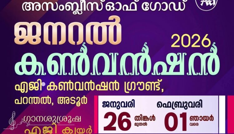 അടൂർ: അസംബ്ലീസ് ഓഫ് ഗോഡ് മലയാളം ഡിസ്ട്രിക്ട് ജനറൽ കൺവൻഷൻ 2026 ജനുവരി 26 തിങ്കൾ മുതൽ ഫെബ്രുവരി 1 ഞായർ വരെ പറന്തൽ എ ജി കൺവൻഷൻ സെൻ്ററിൽ നടക്കും.