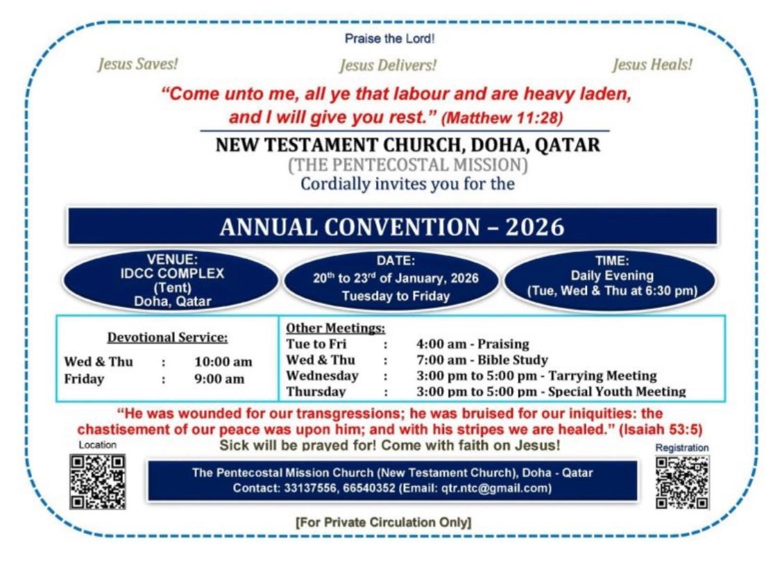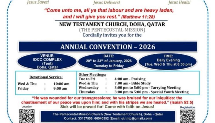 ദോഹ / (ഖത്തർ): ന്യൂ ടെസ്റ്റ്മെന്റ് ചർച്ച് (റ്റി.പി.എം) ദോഹ കൺവൻഷൻ ഇന്ന് ജനുവരി 20 മുതൽ 23 വെള്ളി വരെ ദോഹ ഐ.ഡി.സി.സി കോംപ്ലക്സിൽ (ടെന്റ്) നടക്കും. ദിവസവും വൈകിട്ട് 6.30 ന്സുവിശേഷ പ്രസംഗവും രാവിലെ 4 ന് സ്തോത്ര പ്രാർത്ഥന. ബുധൻ, വ്യാഴം ദിവസങ്ങളിൽ രാവിലെ 10 ന് പൊതുയോഗം. ബുധൻ, വ്യാഴം ദിവസങ്ങളിൽ രാവിലെ 7 ന് ബൈബിൾ ക്ലാസ്, ബുധനാഴ്ച വൈകിട്ട് 3 ന് കാത്തിരിപ്പ് യോഗം. വ്യാഴാഴ്ച വൈകിട്ട് 3 ന് യുവജന മീറ്റിംഗ് എന്നിവയും സമാപന ദിവസമായ വെള്ളിയാഴ്ച രാവിലെ 9 ന് പൊതുയോഗവും നടക്കും.