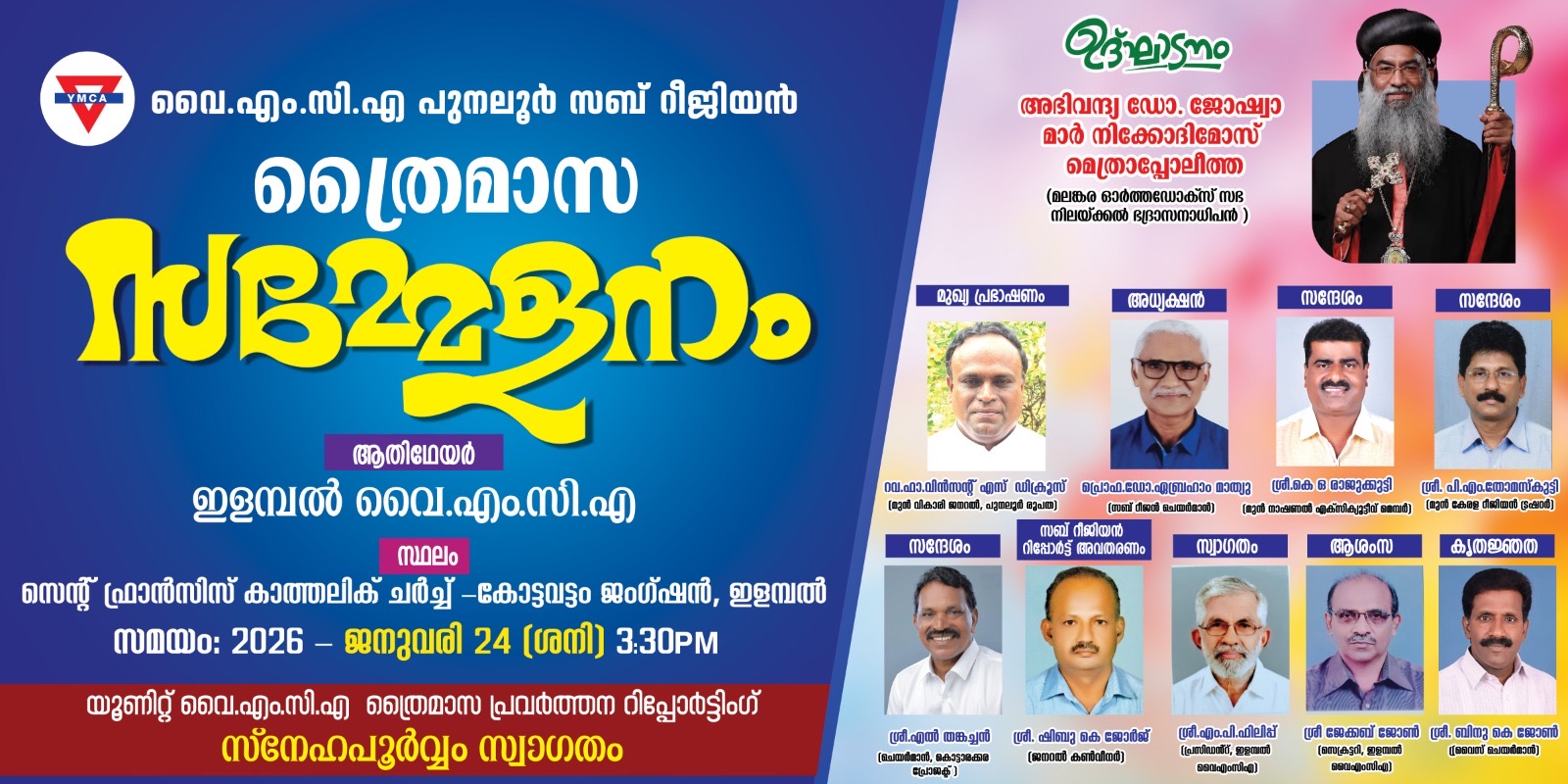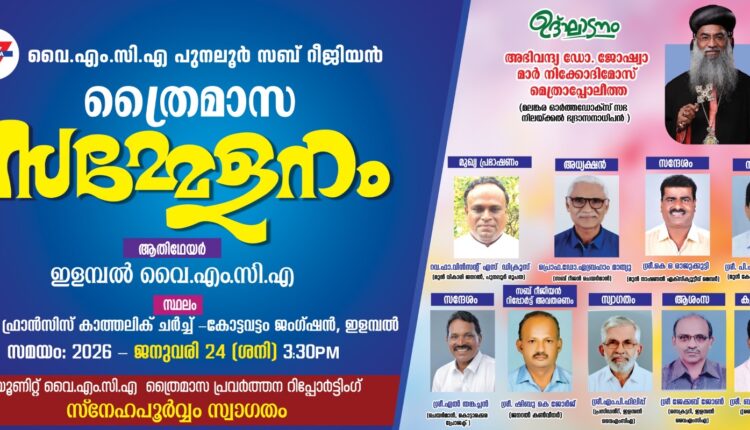 പുനലൂർ സബ് റീജിയൻ സമ്മേളനം 24 ശനിയാഴ്ച 3.30ന് ഇളമ്പൽ കോട്ടവട്ടം ജംഗ്ഷൻ സെൻ്റ് ഫ്രാൻസിസ് കാത്തോലിക്കാ ദേവാലയത്തിൽ നടക്കും. മലങ്കര ഓർത്തഡോക്സ് സഭ നിലയ്ക്കൽ ഭദ്രാസനാധിപൻ ഡോ.ജോഷ്വാ മാർ നിക്കോദിമോസ് ഉദ്ഘാടനം ചെയ്യും.