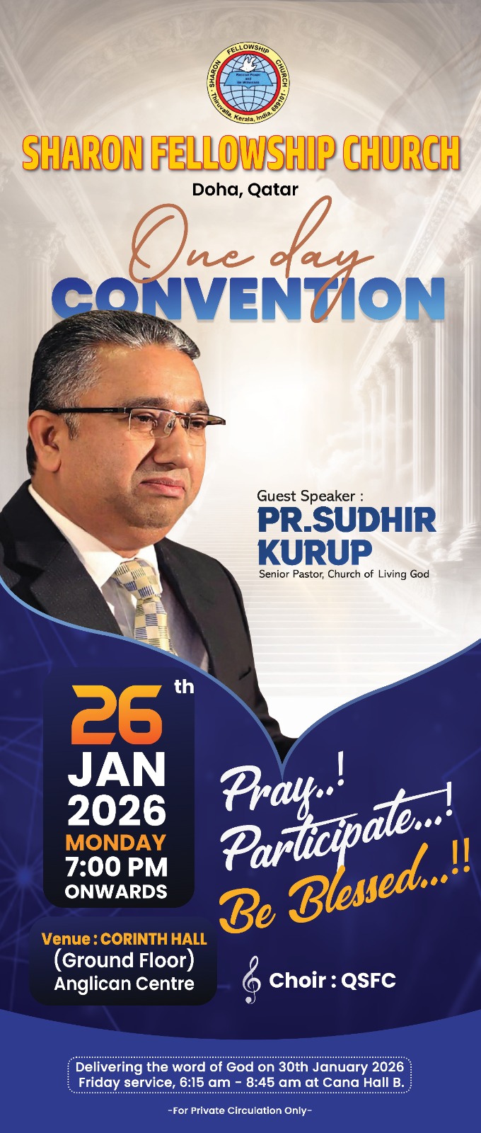 2026 ജനുവരി 26-ന് തിങ്കളാഴ്ച രാത്രി 7.00 മുതൽ ദോഹയിലെ ആംഗ്ലിക്കൻ സെന്ററിലെ കൊരിന്ത് ഹാളിൽ വച്ചാണ് കൺവെൻഷൻ നടക്കുന്നത്