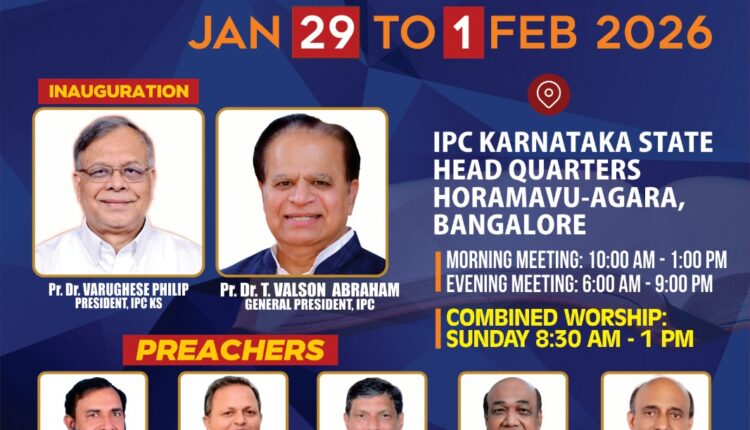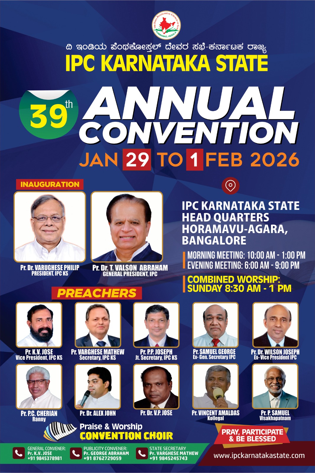 ബെംഗളൂരു: ഇന്ത്യാ പെന്തെക്കൊസ്ത് ദൈവസഭ (ഐപിസി ) കർണാടക സ്റ്റേറ്റ് 39-ാമത് വാർഷിക കൺവൻഷൻ ജനുവരി 29 വ്യാഴം മുതൽ ഫെബ്രു. 1 ഞായർ വരെ ഹൊറമാവ് അഗര ഐ.പി.സി ഹെഡ്ക്വാർട്ടേഴ്സ് ഗ്രൗണ്ടിൽ നടക്കും. വൈകിട്ട് 6ന് സ്റ്റേറ്റ് പ്രസിഡൻറ് പാസ്റ്റർ.ഡോ.വർഗീസ് ഫിലിപ്പ് കൺവൻഷൻ ഉദ്ഘാടനം ചെയ്യും.