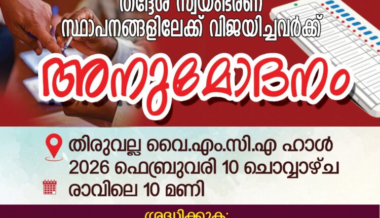 തിരുവല്ല: തദ്ദേശ സ്വയംഭരണ സ്ഥാപനങ്ങളിലേക്ക് വിജയിച്ച വിവിധ പെന്തക്കോസ്ത് സഭാംഗങ്ങളെ പെന്തക്കോസ്തൽ കൗൺസിൽ ഓഫ് ഇന്ത്യ നാഷണൽ സമിതി അനുമോദിക്കുന്നു.