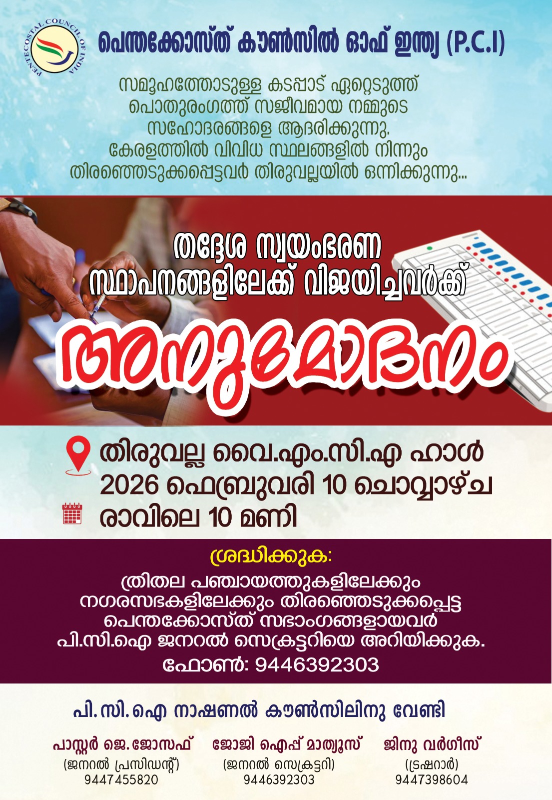 ത്രിതല പഞ്ചായത്തുകളിലേക്കും നഗരസഭകളിലേക്കും തിരഞ്ഞെടുക്കപ്പെട്ട പെന്തക്കോസ്ത് സഭാംഗങ്ങൾ ഫെബ്രുവരി 3 ന് മുൻപ് പി.സി.ഐ ജനറൽ സെക്രട്ടറി ജോജി ഐപ്പ് മാത്യൂസിനെ അറിയിക്കണം.