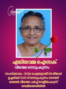 സംസ്കാരം നാളെ 9 തിങ്കൾ ഉച്ചയ്ക്ക് 2 ന് നെടുംകുന്നം വീരന്മല സൗത്ത് ബെഥെൽ ചർച്ച് വെളിയംകുന്ന് സെമിത്തെരിയിൽ.