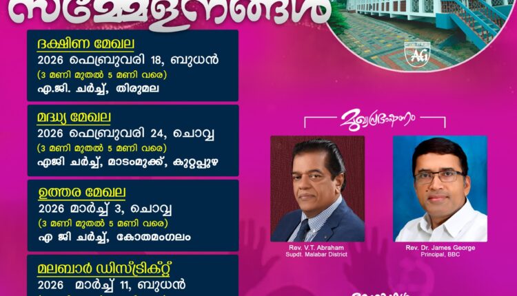 ഉത്തര മേഖലയിൽ കോതമംഗലം എജി സഭയിൽ മാർച്ച് 3 ചൊവ്വാഴ്ച വൈകിട്ട് 3 മണിക്കും നടത്തപ്പെടും.