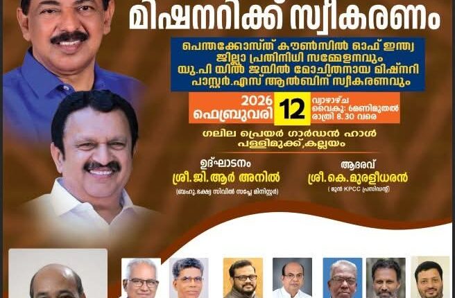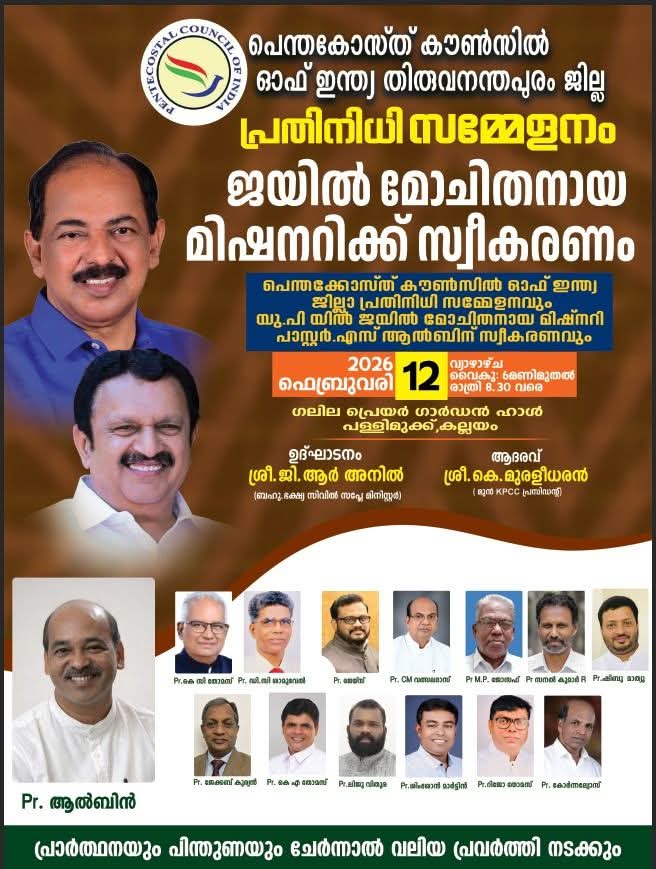 പെന്തകോസ്തൽ കൗൺസിൽ ഓഫ് ഇന്ത്യ കേരളാ സ്റ്റേറ്റ്, തിരുവനന്തപുരം ജില്ലാ കമ്മിറ്റിയുടെ നേതൃത്വത്തിൽ ഇന്ന് വൈകിട്ട് 6 മണിക്ക് നെടുമങ്ങാട്, കല്ലയം പള്ളിമുക്കിൽ വെച്ചാണ് സ്വീകരണ പരിപാടി സംഘടിപ്പിച്ചിരിക്കുന്നത്.