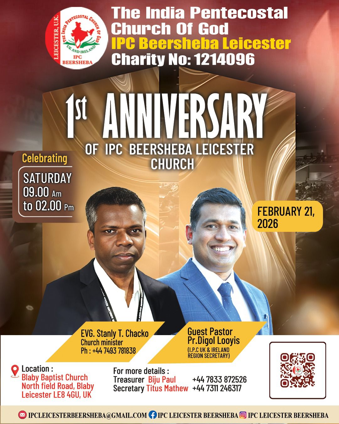 ലെസ്റ്റർ: ഒരു വർഷം പിന്നിടുന്ന ഐ.പി.സി ബെർഷേബ ലെസ്റ്റർ സഭയുടെ പ്രഥമ വാർഷിക പൊതുയോഗം 2026 ഫെബ്രുവരി 21-ാം തീയതി ശനിയാഴ്ച രാവിലെ 9 മണിക്ക് ബ്ലാബി ബാപ്റ്റിസ്റ്റ് ചർച്ച്, നോർത്ത്ഫീൽഡ് റോഡ്, ബ്ലാബി, ലെസ്റ്റർ (LE8 4GU)യിൽ നടത്തപ്പെടും.