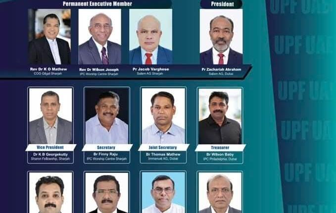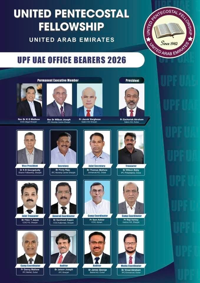 ഷാർജ: യുഎഇയിലെ പെന്തക്കോസ്ത് സഭകളുടെ ഐക്യ കൂട്ടായ്മയായ യു.പി.എഫ്, സഭകളുടെ ആത്മീയ വളർച്ചക്കും ഐക്യത്തിനും നവീകരണത്തിനുമായി വിവിധ പ്രവർത്തനങ്ങൾ നടത്തി വരുന്ന സംഘടനയുടെ 2026-ലെ പ്രവർത്തന വർഷത്തേക്കുള്ള പുതിയ ഭരണസമിതി ചുമതലയേറ്റു. ഷാർജ വർഷിപ്പ് സെൻററിൽ നടന്ന പൊതുയോഗത്തിലാണ് പുതിയ ഭാരവാഹികളെ തെരഞ്ഞെടുത്തത്.