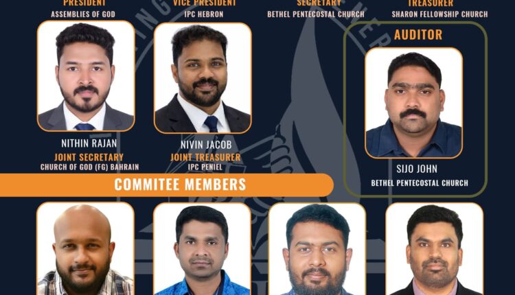 പുതിയ ഭാരവാഹികൾ: പ്രസിഡന്റ് മാർട്ടിൻ ജോ മാത്യു (അസംബ്ലീസ് ഓഫ് ഗോഡ്), വൈസ് പ്രസിഡന്റ് എബെൻ ജെയിംസ് (ഐ.പി.സി ഹെബ്രോൺ), സെക്രട്ടറി ആഷിക് മുരളി (ബെഥേൽ പെന്തെക്കോസ്തൽ ചർച്ച്), ട്രഷറർ ബെൻ മോനി (ശാരോൺ ഫെലോഷിപ്പ് ചർച്ച്), ജോയിന്റ് സെക്രട്ടറി നിതിൻ രാജൻ (ചർച്ച് ഓഫ് ഗോഡ് എഫ്.ജി ബഹ്റൈൻ), ജോയിന്റ് ട്രഷറർ നിവിൻ ജേക്കബ് (ഐ.പി.സി പെനിയേൽ), ഓഡിറ്റർ സിജോ ജോൺ (ബെഥേൽ പെന്തെക്കോസ്തൽ ചർച്ച്).