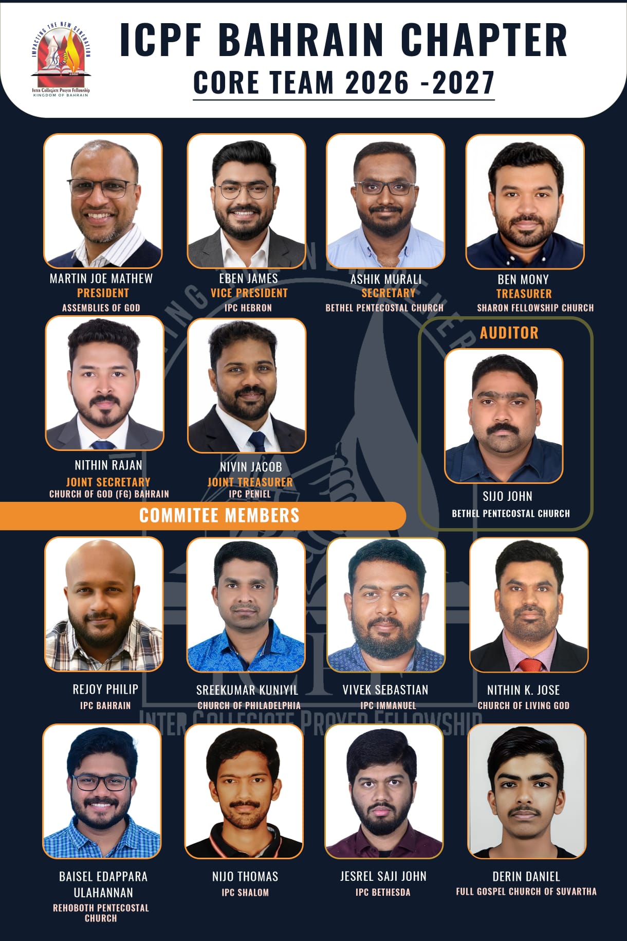 കമ്മിറ്റിയംഗങ്ങളായി റിജോയ് ഫിലിപ്പ് (ഐ.പി.സി ബഹ്റൈൻ), ശ്രീകുമാർ കുന്നിയിൽ (ചർച്ച് ഓഫ് ഫിലഡൽഫിയ), വിവേക് സെബാസ്റ്റ്യൻ (ഐ.പി.സി ഇമ്മാനുവേൽ), നിതിൻ കെ. ജോസ് (ചർച്ച് ഓഫ് ലിവിംഗ് ഗോഡ്), ബേസിൽ ഇടപ്പാറ ഉലഹന്നാൻ (രെഹബോത്ത് പെന്തെക്കോസ്തൽ ചർച്ച്), നിജോ തോമസ് (ഐ.പി.സി ശാലോം), ജെസ്രെൽ സജി ജോൺ (ഐ.പി.സി ബെഥെസ്ത), ഡെറിന് ഡാനിയേൽ (ഫുൾ ഗോസ്പൽ ചർച്ച് ഓഫ് ഗാഡ്) എന്നിവരെ തെരഞ്ഞെടുത്തു.