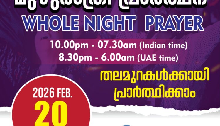 പ്രാർത്ഥനാസംഗമം ഒരുക്കുന്ന മുഴുരാത്രി പ്രാർത്ഥന ഫെബ്രുവരി 20, ഇന്ന് രാത്രി