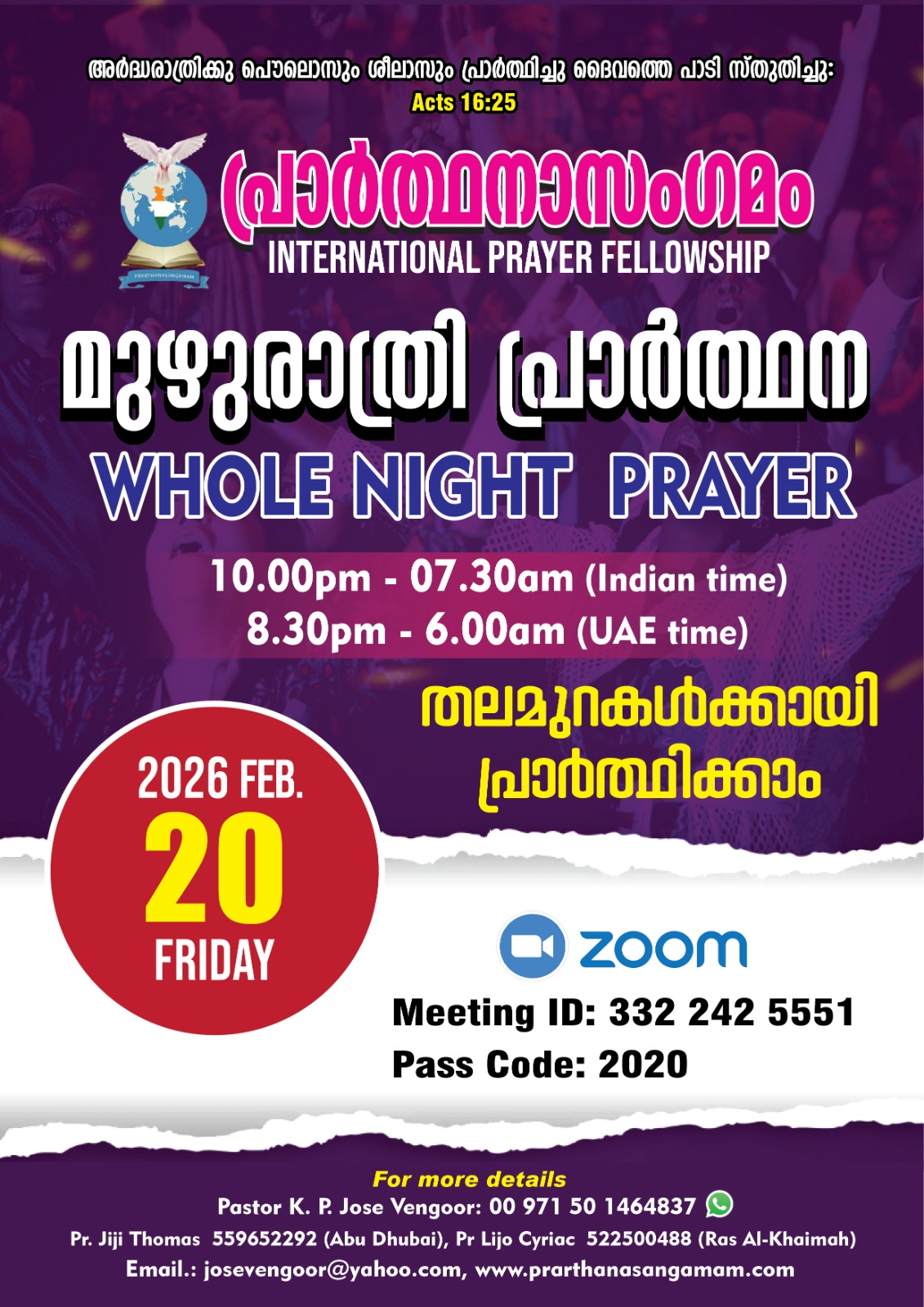ഷാർജ: പ്രാർത്ഥനാസംഗമം (ഇന്റർനാഷണൽ പ്രയർ ഫെലോഷിപ്പ്) സംഘടിപ്പിക്കുന്ന മുഴുരാത്രി പ്രാർത്ഥന ഇന്ന് (ഫെബ്രുവരി 20) രാത്രി 8.30 മുതൽ രാവിലെ 6 വരെ (യു.എ.ഇ സമയം) സൂം പ്ലാറ്റ്ഫോമിലൂടെ നടക്കും.