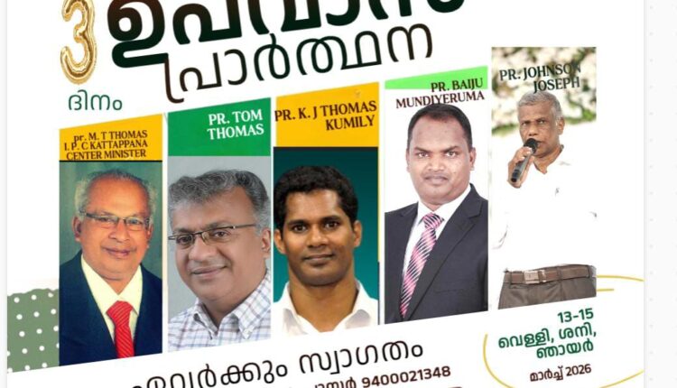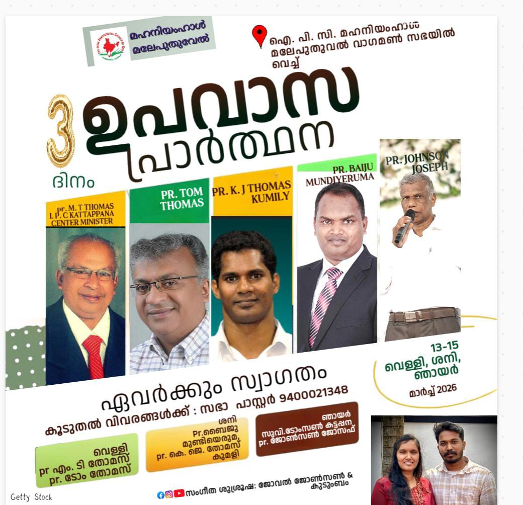 വാഗമൺ : ഐ. പി. സി. മഹനീയംഹാൾ മലയിൽ പുതുവേൽ സഭയിൽ വച്ച് മാർച്ച് മാസം 13 14 15 തീയതികളിൽ ഉപവാസ പ്രാർത്ഥനകൾ നടത്തപ്പെടുന്നു. പതിമൂന്നാം തീയതി വെള്ളിയാഴ്ച്ച രാവിലെ കട്ടപ്പന സെന്റർ മിനിസ്റ്റർ പാസ്റ്ററെ എം. ടി. തോമസ് ഉദ്ഘാടനം ചെയ്യുകയും വചന സന്ദേശം നൽകുകയും ചെയ്യുന്നു. കൂടാതെ ഈ കാലഘട്ടങ്ങളിൽ കർത്താവ് ശക്തമായ ഉപയോഗിച്ചുകൊണ്ടിരിക്കുന്ന ദൈവദാസന്മാരായ പാസ്റ്റർ ടോം തോമസ്, പാസ്റ്റർ ബൈജു മുണ്ടിയേരുമ, പാസ്റ്റർ കെ ജെ തോമസ് കുമളി,