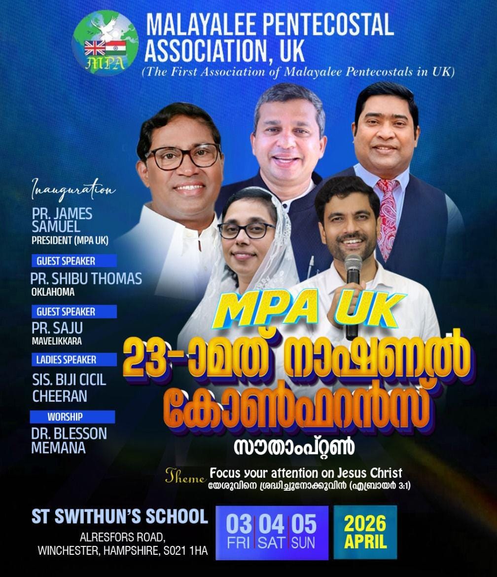 യു.കെ: യു.കെയിലെ മലയാളി പെന്തെക്കൊസ്ത് സമൂഹത്തിന്റെ ആദ്യത്തെ ഐക്യ കൂട്ടായ്മയായ മലയാളി പെന്തെക്കൊസ്തൽ അസോസിയേഷന്റെ 23 മത് നാഷണൽ കോൺഫറൻസ് ഇംഗ്ലണ്ടിലെ തുറമുഖ പട്ടണമായ സൗതാംപ്റ്റണിൽ വെച്ചു 2026 ഏപ്രിൽ 3 മുതൽ 5 വരെ നടക്കും.