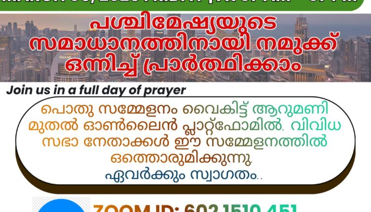 പശ്ചിമേഷ്യയിലെ സമാധാനത്തിനായി ക്രൈസ്തവ എഴുത്തുപുര യു.എ.ഇ ചാപ്റ്റർ അപ്പർ റൂം സംഘടിപ്പിക്കുന്ന പ്രാർത്ഥനാ ദിനം മാർച്ച് 6-ന്