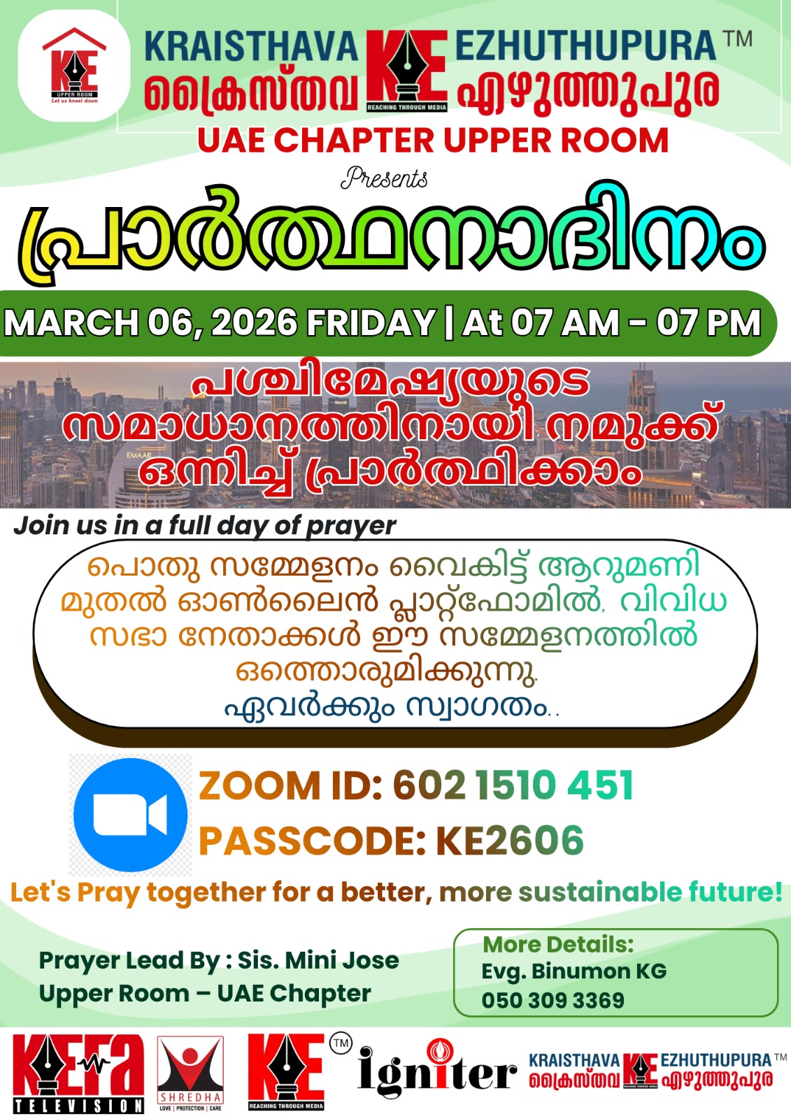 പൊതുസമ്മേളനം വൈകിട്ട് 6:00 മുതൽ ഓൺലൈൻ പ്ലാറ്റ്ഫോമിലൂടെ നടക്കും. യുഎഇയിലെയും മറ്റിതര സ്ഥലങ്ങളിലെയും വിവിധ സഭാ നേതാക്കൾ സമ്മേളനത്തിൽ പങ്കുചേരും.എല്ലാവരെയും ഈ അനുഗ്രഹീത പ്രാർത്ഥനാ ദിനത്തിലേക്ക് ഹൃദയപൂർവ്വം സ്വാഗതം ചെയ്യുന്നു.
