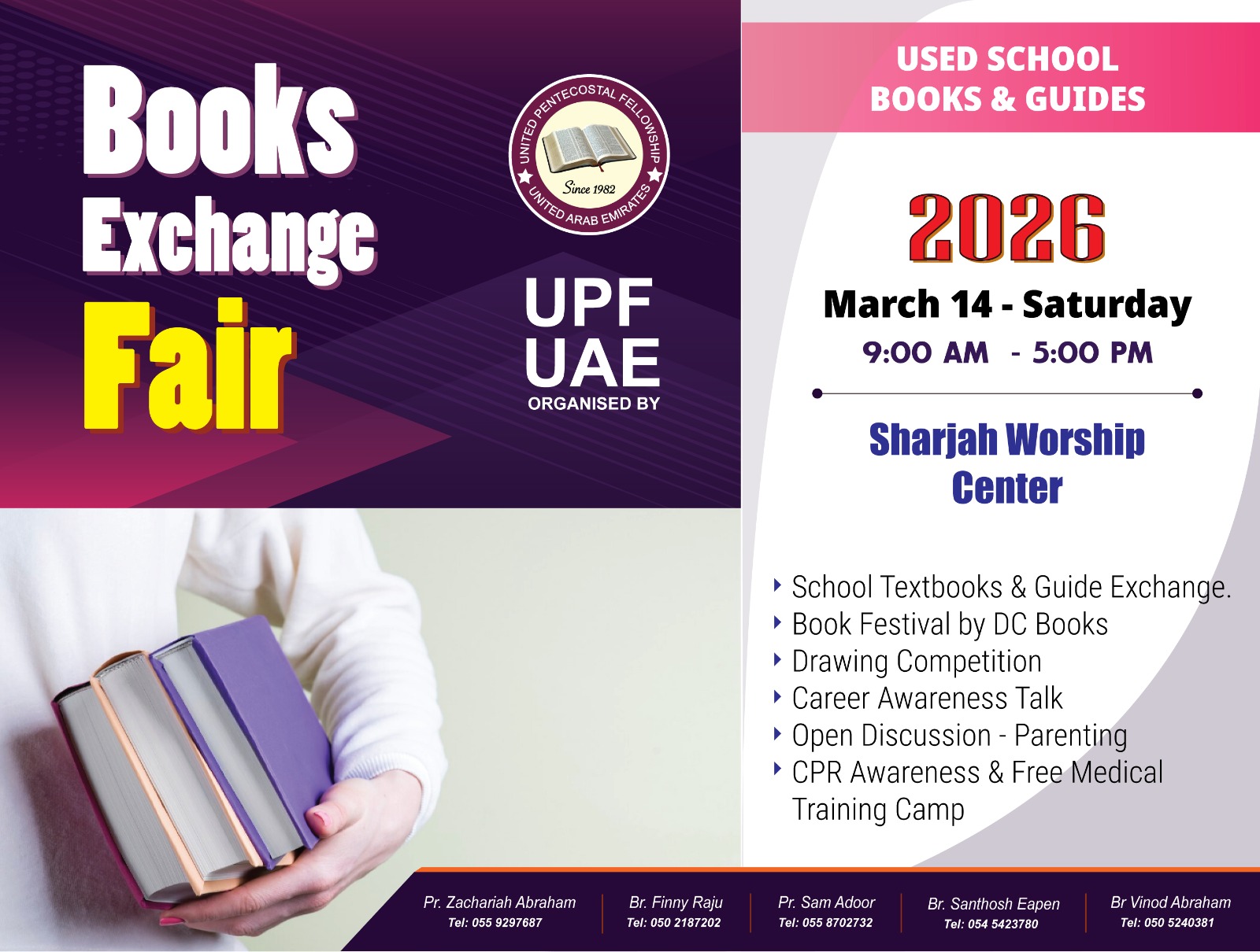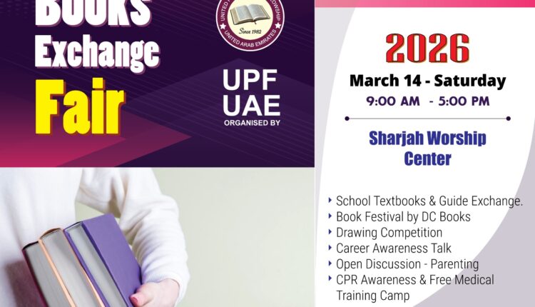 സാമൂഹിക പ്രവർത്തനങ്ങളുടെ ഭാഗമായി യു.പി.എഫ് – യു.എ.ഇ ആഭിമുഖ്യത്തിൽ സ്കൂൾ ബുക്ക് എക്സ്ചേഞ്ച് മേള മാർച്ച് 14 ശനിയാഴ്ച രാവിലെ 9 മണി മുതൽ ഷാർജയിൽ വാർഷിപ് സെന്ററിൽ നടക്കും.