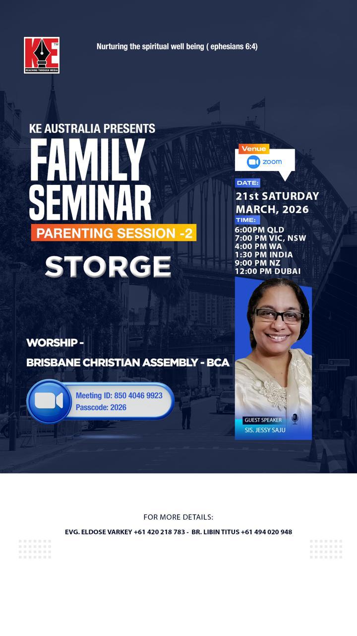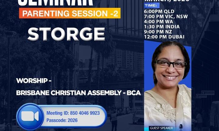 ഓൺലൈനായി ക്രമിക്കിരിച്ചിരിക്കുന്ന യോഗത്തിൽ സുപ്രസിദ്ധ സുവിശേഷകൻ ഇവാ. സാജു ജോൺ മാത്യുവിന്റെ പത്നി സിസ്റ്റർ ജെസ്സി സാജു ക്ലാസുകൾ നയിക്കുന്നു. തലമുറകളെ ദൈവ സ്നേഹത്തിലും പത്യോപദേശത്തിലും വളർത്തുന്നതിനു ഏറെ വെല്ലുവിളികൾ നേരിടുന്ന ഈ കാലഘട്ടത്തിൽ ഈ സെമിനാർ മാതാപിതാക്കൾക്ക് ഏറെ ഗുണമായിരിക്കും എന്നതിൽ സംശയമില്ല. യോഗത്തിൽ ബ്രിസ്ബെയ്ൻ ക്രിസ്ത്യൻ അസംബ്ലി ഗാനശുശ്രൂഷയ്ക്ക് നേതൃത്വം നൽകും. പ്രസ്തുത യോഗത്തിലേക്ക് ഞങ്ങൾ ഏവരെയും സഹർഷം സ്വാഗതം ചെയുന്നു. സൂം മീറ്റിംഗ് ലിങ്ക് ചുവടെ: Join Zoom Meeting: https://us02web.zoom.us/j/85040469923?pwd=MFvOiXpNTXPtWCyZCQbM5BpDeqbhkh.1 Meeting ID: 850 4046 993 | Passcode: 2026