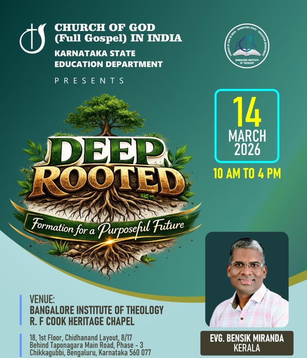 ബെംഗളൂരു : ചർച്ച് ഓഫ് ഗോഡ് ഇൻ ഇന്ത്യ കർണാടക സ്റ്റേറ്റ് എഡ്യൂക്കേഷൻ ഡിപ്പാർട്ട്മെന്റിന്റെ ആഭിമുഖ്യത്തിൽ മാർച്ച് 14 ന് പ്രീ മാരിറ്റൽ ക്ലാസ് (വിവാഹത്തിന് മുമ്പുള്ള ക്ലാസ് )ഡീപ് റൂട്ടഡ് നടക്കും.