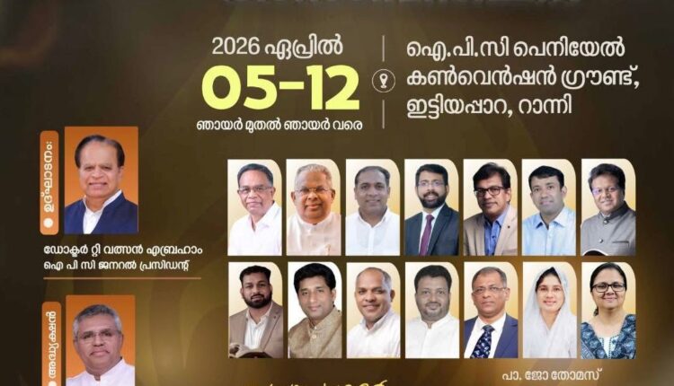 റാന്നി: ഐ.പി.സി റാന്നി ഈസ്റ്റ് സെന്ററിന്റെ 102-ാമത് കൺവെൻഷൻ 2026 ഏപ്രിൽ 5 മുതൽ 12 വരെ റാന്നി ഇട്ടിയപ്പാറയിലെ ഐ.പി.സി പെനിയേൽ കൺവെൻഷൻ ഗ്രൗണ്ടിൽ നടക്കും. രാവിലെ, വൈകിട്ട് പൊതുയോഗങ്ങൾ നടക്കും.