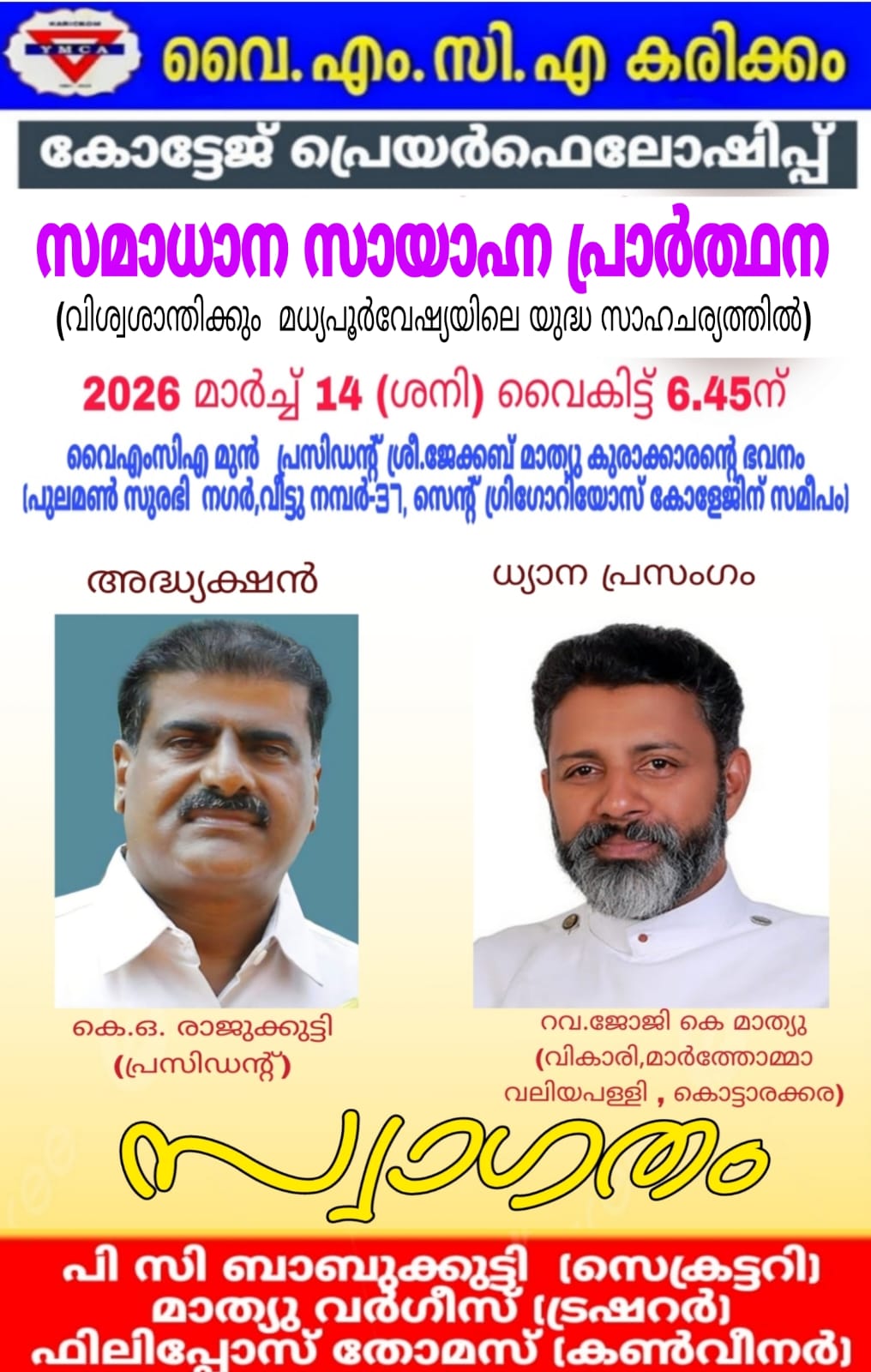 കൊട്ടാരക്കര: കരിക്കം വൈഎംസിഎ കോട്ടേജ് പ്രെയർ ഫെലോഷിപ്പും മധ്യപൂർവ്വ ഏഷ്യയിലെ യുദ്ധ സാഹചര്യത്തിൽ ശാശ്വത സമാധാനത്തിനു വേണ്ടിയുള്ള സമാധാന പ്രാർത്ഥന സംഗമവും ഇന്ന് (14/03-ശനി) വൈകിട്ട് 6.45ന് പുലമൺ സുരഭി നഗർ പടിഞ്ഞാറേ വീട്ടിൽ ജേക്കബ് മാത്യു കുരാക്കാരൻ്റെ ഭവനത്തിൽ നടക്കും.