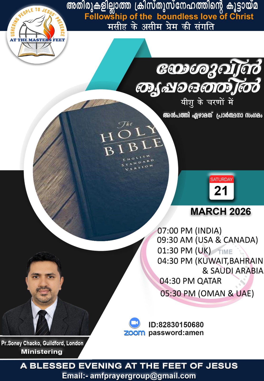 യേശുവിൻ തൃപ്പാദത്തിൽ 57-ാം മത് പ്രാർത്ഥനാ സംഗമം മാർച്ച് 21 ശനിയാഴ്ച രാത്രി 7.00 ന് ഓൺലൈനിൽ