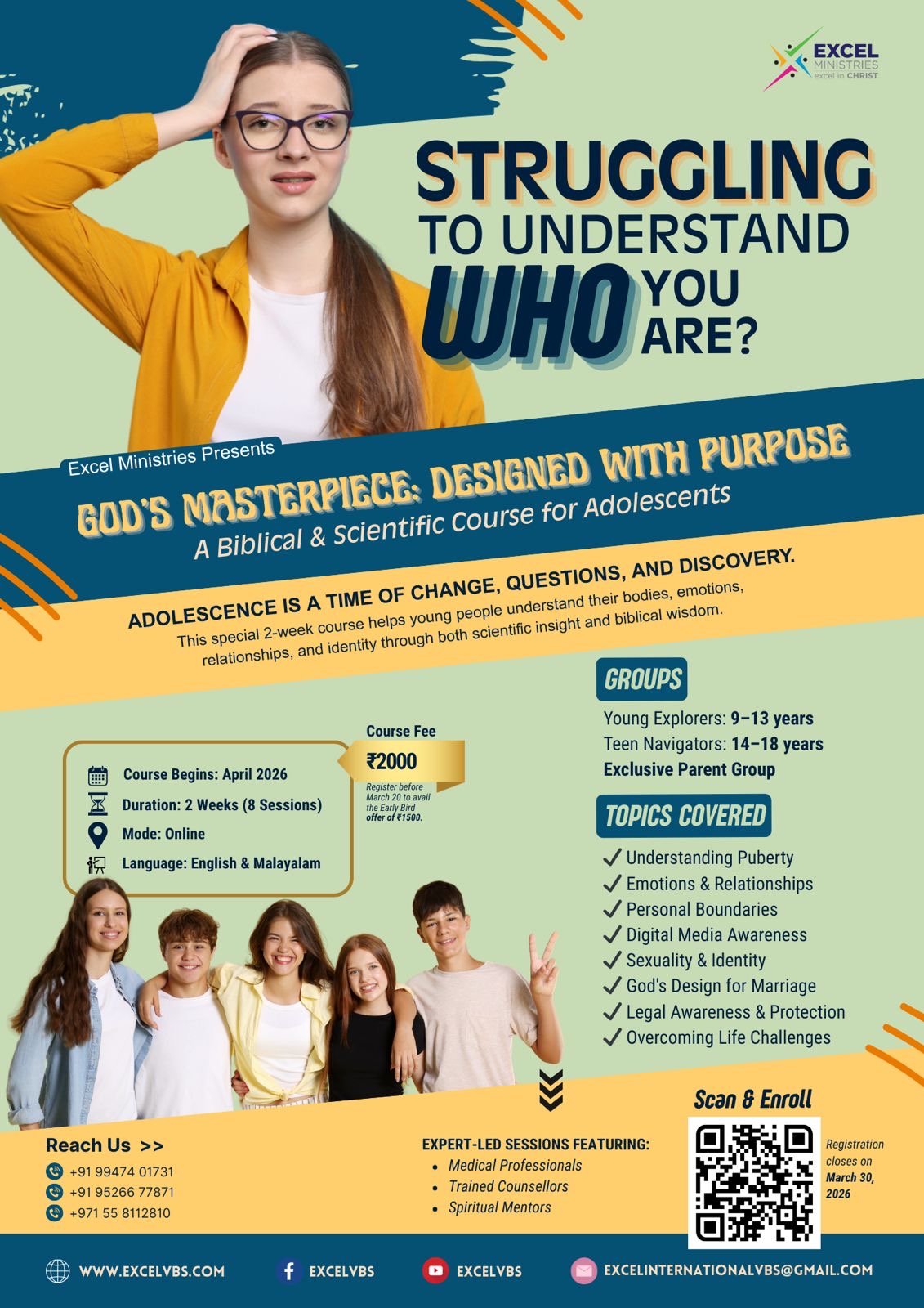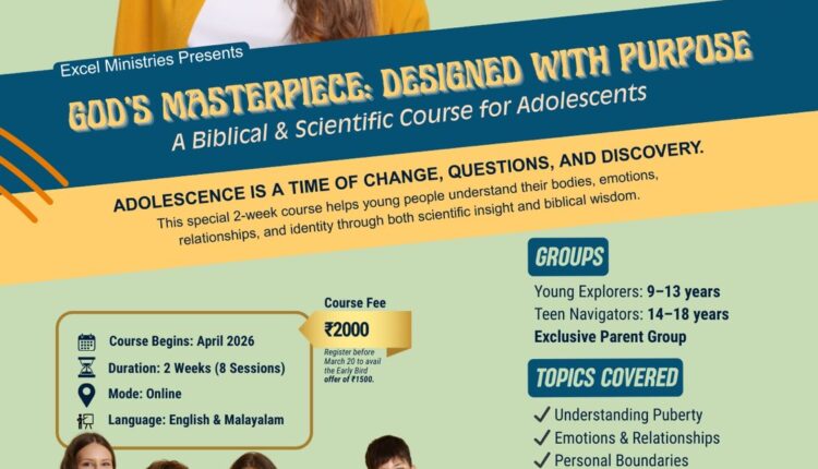 തിരുവല്ല: കൗമാരലൈംഗികതയെക്കുറിച്ച് കുട്ടികൾക്ക് അറിവ് നൽകുക എന്ന ലക്ഷ്യത്തോടെ എക്സൽ മിനിസ്ട്രീസ് അവധിക്കാലത്ത് ആരംഭിക്കുന്ന ഗോഡ്സ് മാസ്റ്റർപീസ് ഡിസൈൻഡ് വിത്ത് പർപ്പസ് (God’s Masterpiece: Designed with Purpose) എന്ന ഹൃസ്വകാല കോഴ്സിൻ്റെ രജിസ്ട്രേഷൻ ആരംഭിച്ചു. 9 വയസ്സു മുതൽ 18 വയസ്സ് വരെയുള്ളവർക്കാണ് പ്രവേശനം.