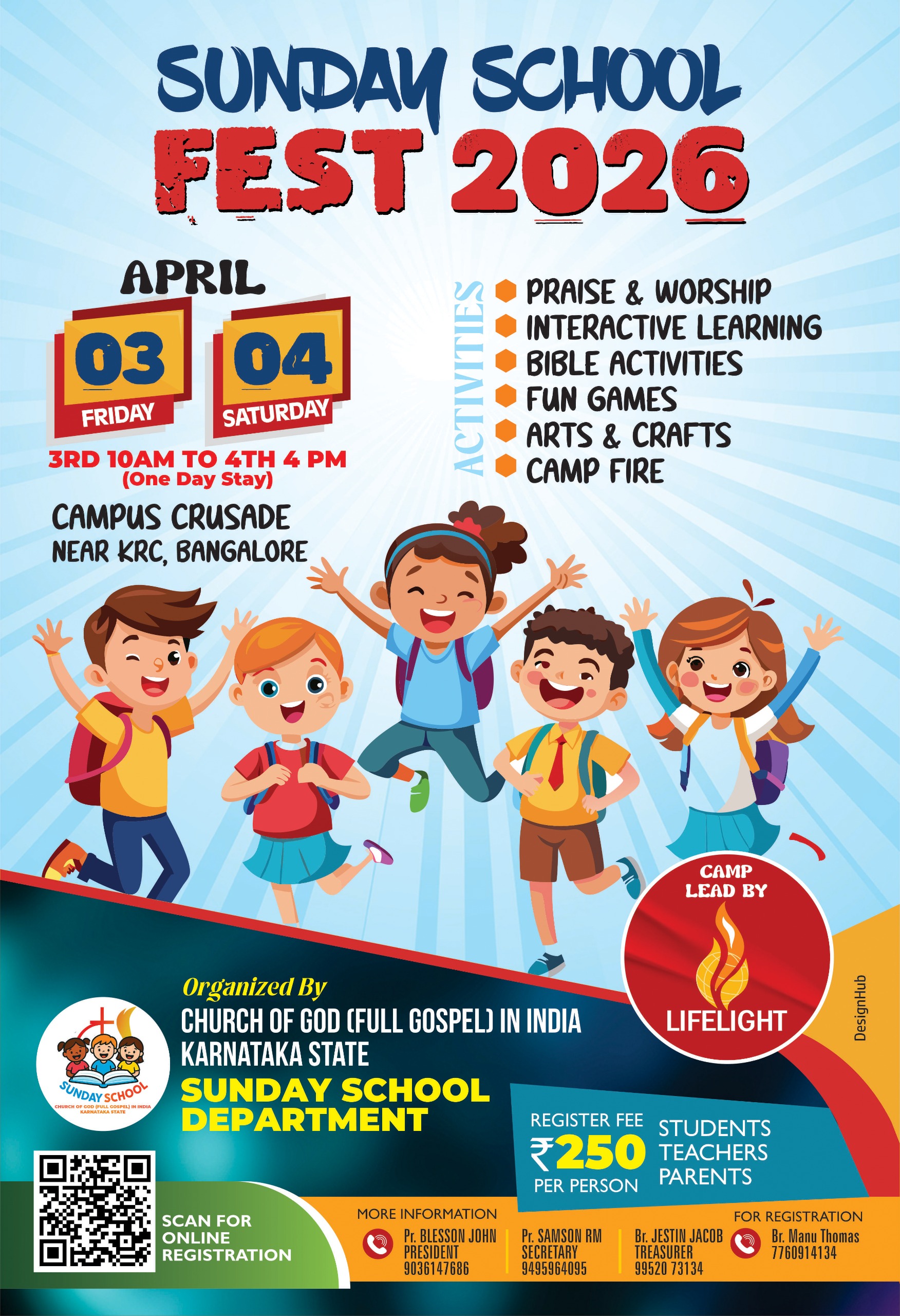 ബെംഗളൂരു: ചർച്ച് ഓഫ് ഗോഡ് കർണ്ണാടക സ്റ്റേറ്റ് സൺഡേ സ്കൂൾ ഡിപ്പാർട്ടുമെന്റിന്റെ ദ്വിദിന പ്രോഗ്രാം 2026 ഏപ്രിൽ 3, 4 തീയതികളിൽ ബാംഗ്ലൂർ KRC ക്ക് സമീപമുള്ള ക്യാമ്പസ് ക്രൂസൈഡ് ക്യാമ്പ് സെന്ററിൽ നടക്കും. രാവിലെ 9-ന് ആരംഭിക്കുന്ന രജിസ്ട്രേഷനോടു കൂടി പോഗ്രാമുകൾ ആരംഭിക്കും.
