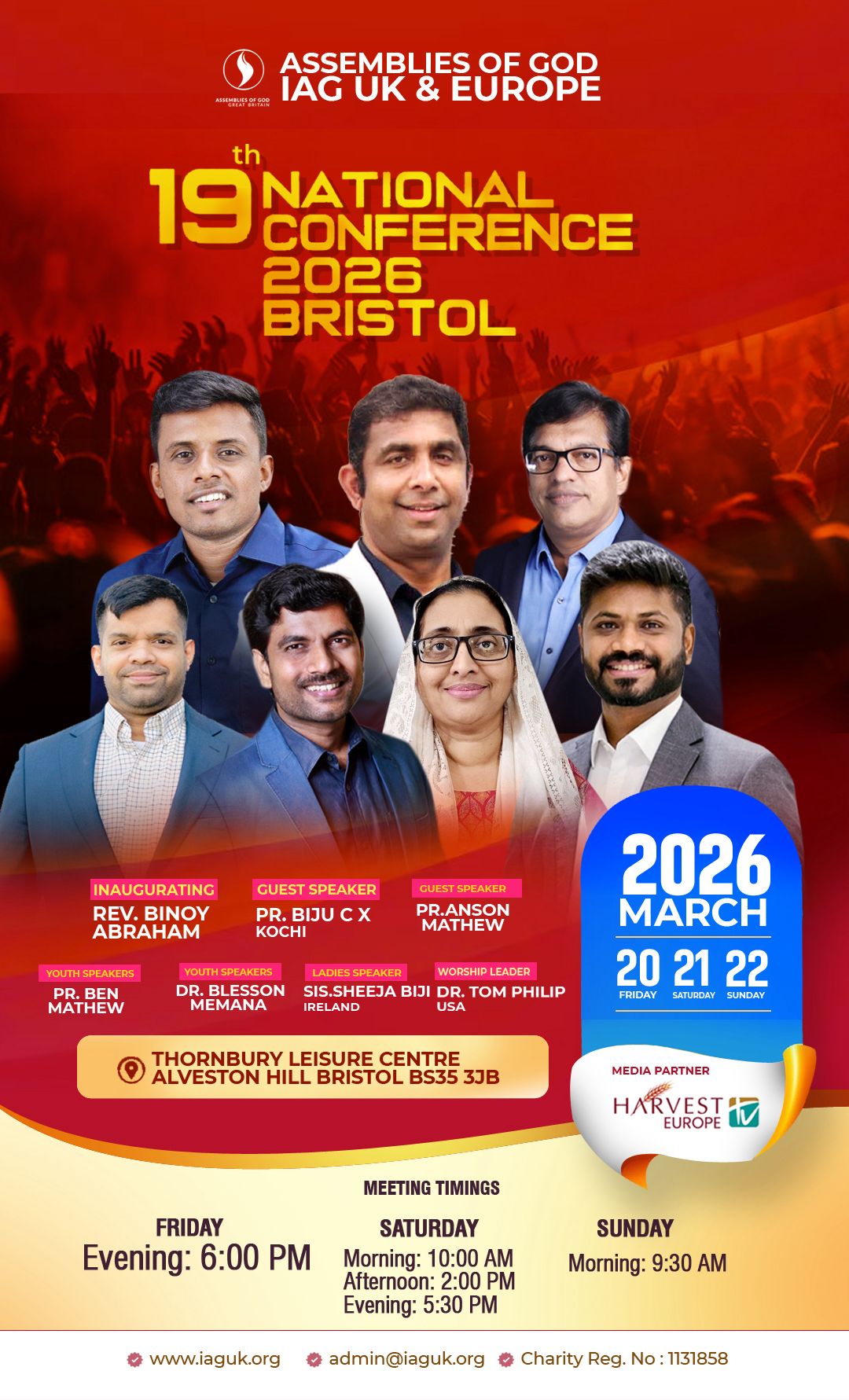 മാർച്ച് 20 വെള്ളിയാഴ്ച വൈകുന്നേരം 6 ന് തോൺബറി ലെയ്ഷർ സെന്ററിൽ വച്ച് ആരംഭിക്കുന്ന പൊതുയോഗം മാർച്ച് 22 ന് സഭായോഗത്തോട് കൂടി സമാപിക്കും.