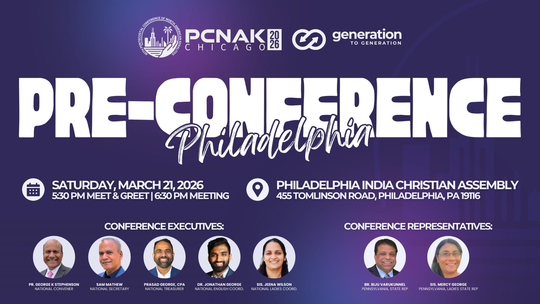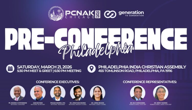 ശനിയാഴ്ച വൈകിട്ട് ആറര മണിക്ക് ഫിലദൽഫിയ ഇന്ത്യ ക്രിസ്ത്യൻ അസംബ്ലിയിൽ വച്ചാണ് സമ്മേളനം നടക്കുന്നത്. ബിജു വരുകുന്നേൽ,മേഴ്സി ജോർജ് എന്നിവർ നേതൃത്വം നൽകും.
