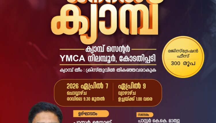 ഏപ്രിൽ 7ന് രാവിലെ 9.30ന് ആരംഭിക്കുന്ന ക്യാമ്പ് ഏപ്രിൽ 9ന് ഉച്ചയ്ക്ക് 1.00 വരെ തുടരും. പ്രസ്തുത ക്യാമ്പിൽ പാസ്റ്റർ മനോജ് ഉത്ഘാടന പ്രഭാഷണം നടത്തും.