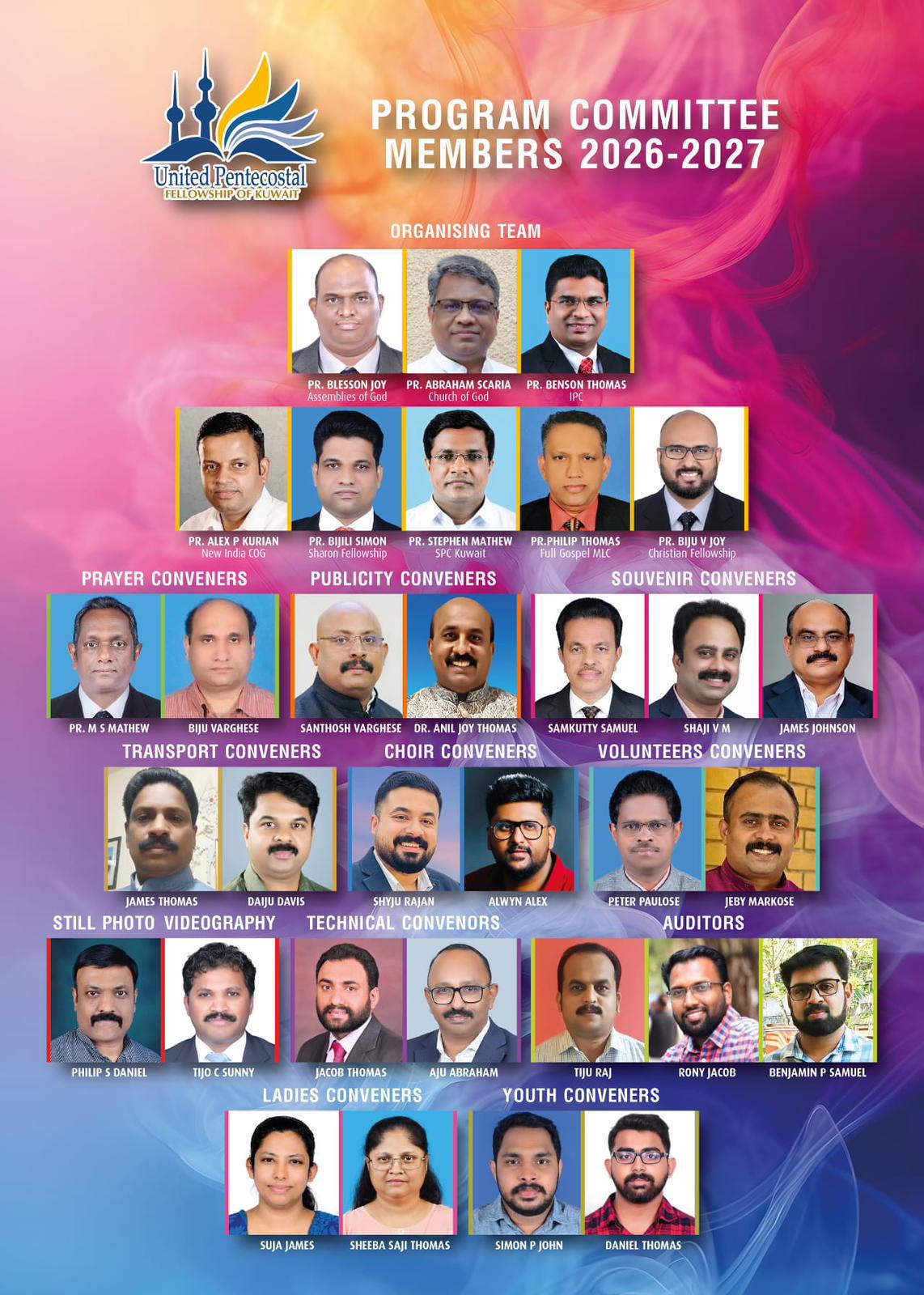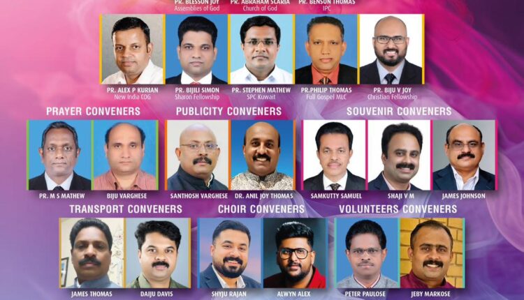 സംഘാടക നേതൃത്വത്തിൽ പാസ്റ്റർ . ബ്ലെസ്സൺ ജോയ് (അസംബ്ലീസ് ഓഫ് ഗോഡ് ), പാസ്റ്റർ . ഏബ്രഹാം സ്കറിയ (ചർച്ച് ഓഫ് ഗോഡ്), പാസ്റ്റർ.ബെൻസൺ തോമസ് (ഐപിസി) പാസ്റ്റർ അലക്സ് പി കുര്യൻ (ന്യൂ ഇന്ത്യ സിഒജി), പാസ്റ്റർ ബിജിലി സൈമൺ (ഷാറോൻ ഫെല്ലോഷിപ്പ്), പാസ്റ്റർ സ്റ്റീഫൻ മാത്യു (എസ്പിസി കുവൈറ്റ്), പാസ്റ്റർ ഫിലിപ്പ് തോമസ് (ഫുൾ ഗോസ്പൽ എംഎൽസി ), പാസ്റ്റർ ബിജു വി ജോയ് (ക്രിസ്ത്യൻ ഫെല്ലോഷിപ്പ്) എന്നിവർ തിരഞ്ഞെടുക്കപ്പെട്ടു.